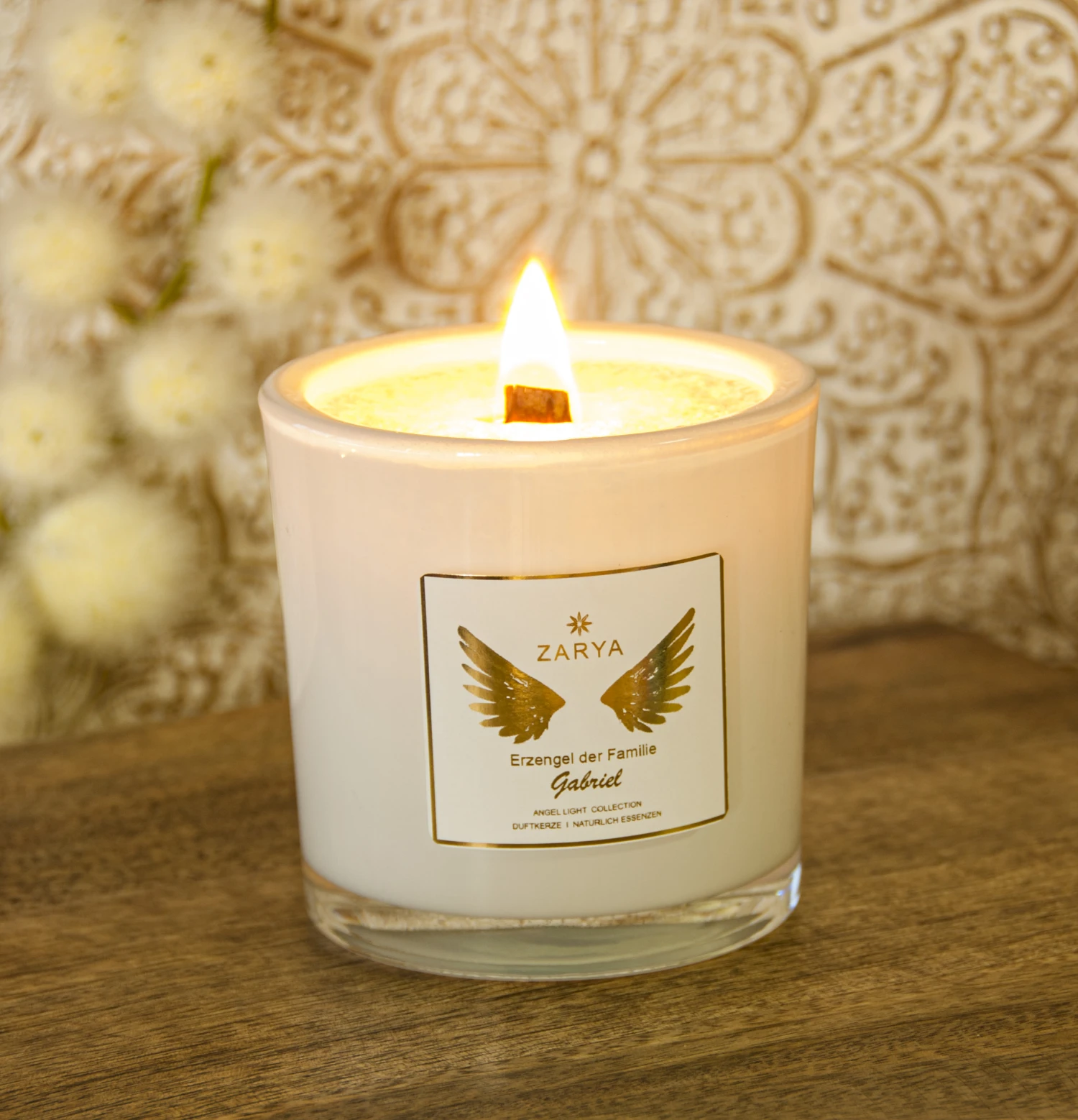 Ein hochwertiger Holzbreitstab rundet die Exklusivität der Engelkerze ab.