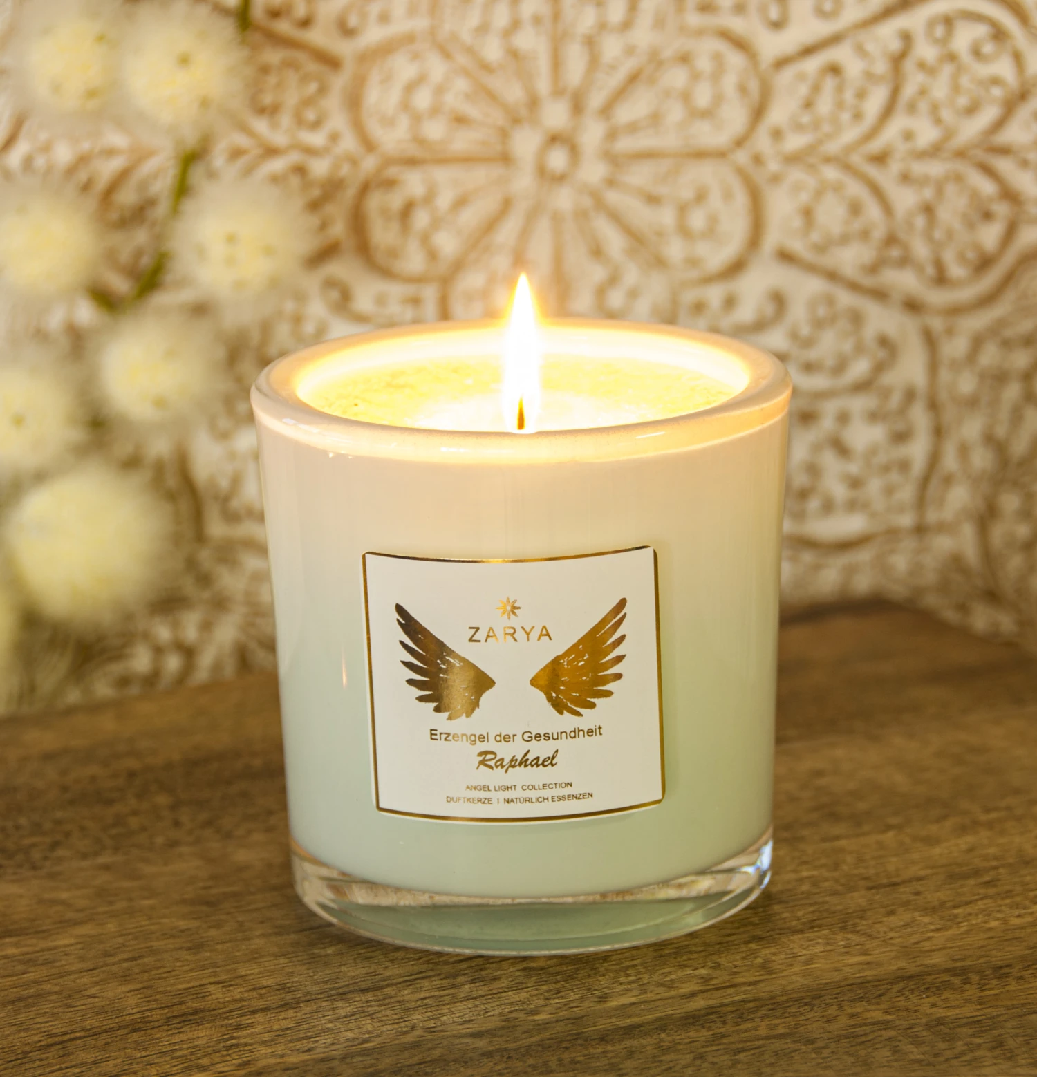 Sein Name bedeutet „Gott heilt“ und er steht für die durchdringende, göttliche Kraft. Erzengel Raphael verkörpert Vollkommenheit, Regeneration und Erneuerung. Überall dort wo in uns Schmerz existiert, bringt das Licht der Intentionskerze des Erzengels Raphael Balsam, Hoffnung und Mut.