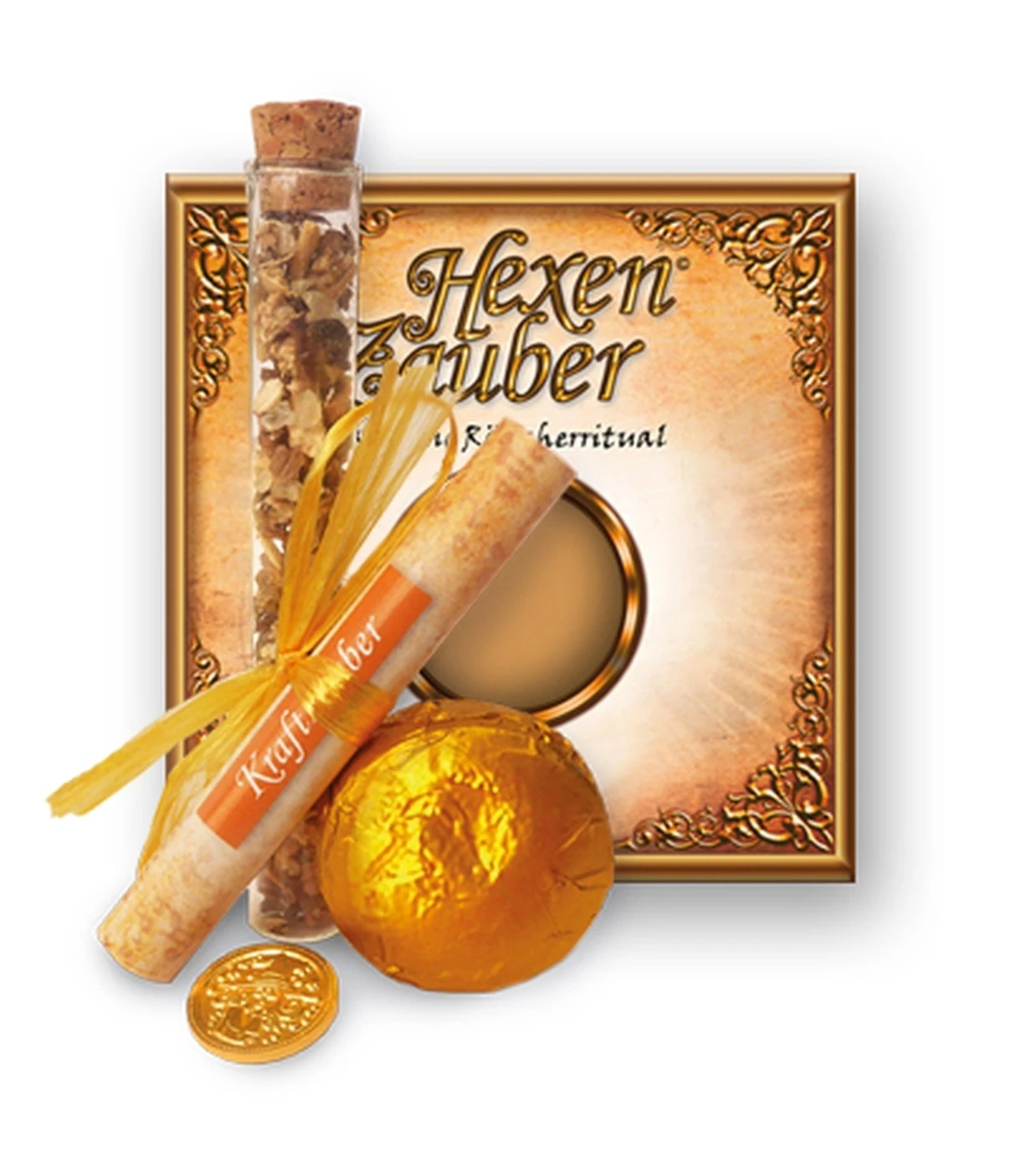 Der Hexenzauber wird in einer kleinen Schachtel geliefert (9,5 cm x 9,5 cm x 1,5 cm). Mit einer Räuchermischung im 10 ml Korkfläschchen, einer Kohletablette, einem kleinen Hexentaler und einer Ritualanleitung mit Zauberspruch.