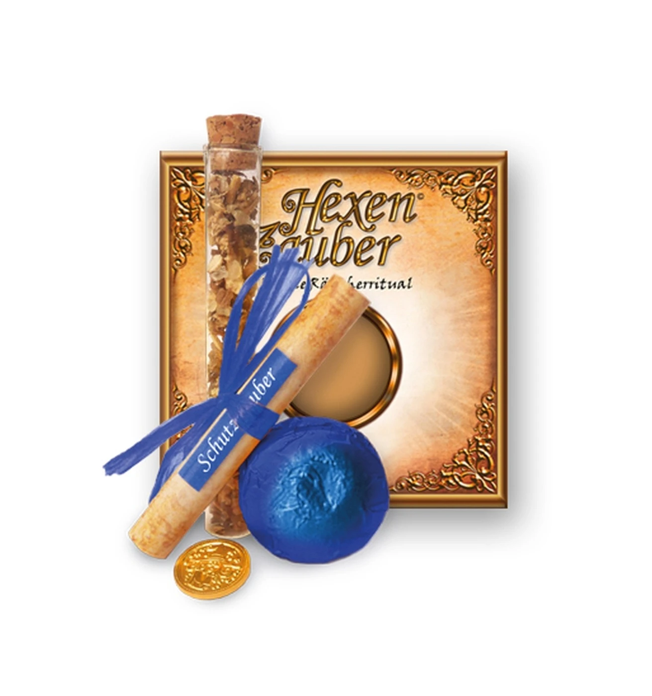 Der Hexenzauber wird in einer kleinen Schachtel geliefert (9,5 cm x 9,5 cm x 1,5 cm). Mit einer Räuchermischung im 10 ml Korkfläschchen, einer Kohletablette, einem kleinen Hexentaler und einer Ritualanleitung mit Zauberspruch.