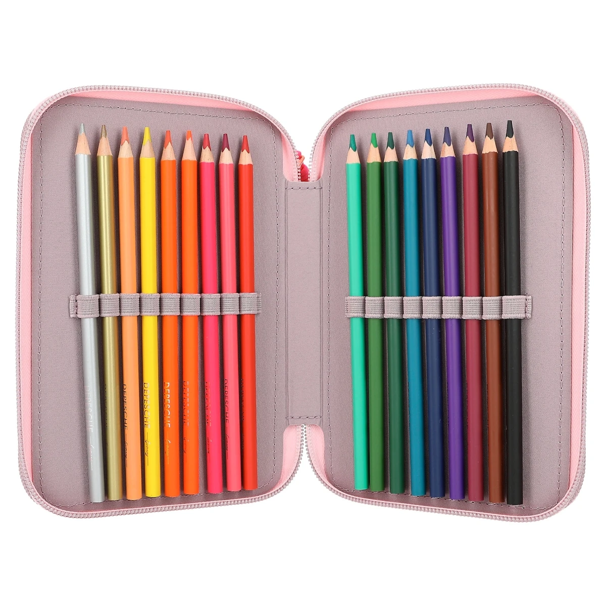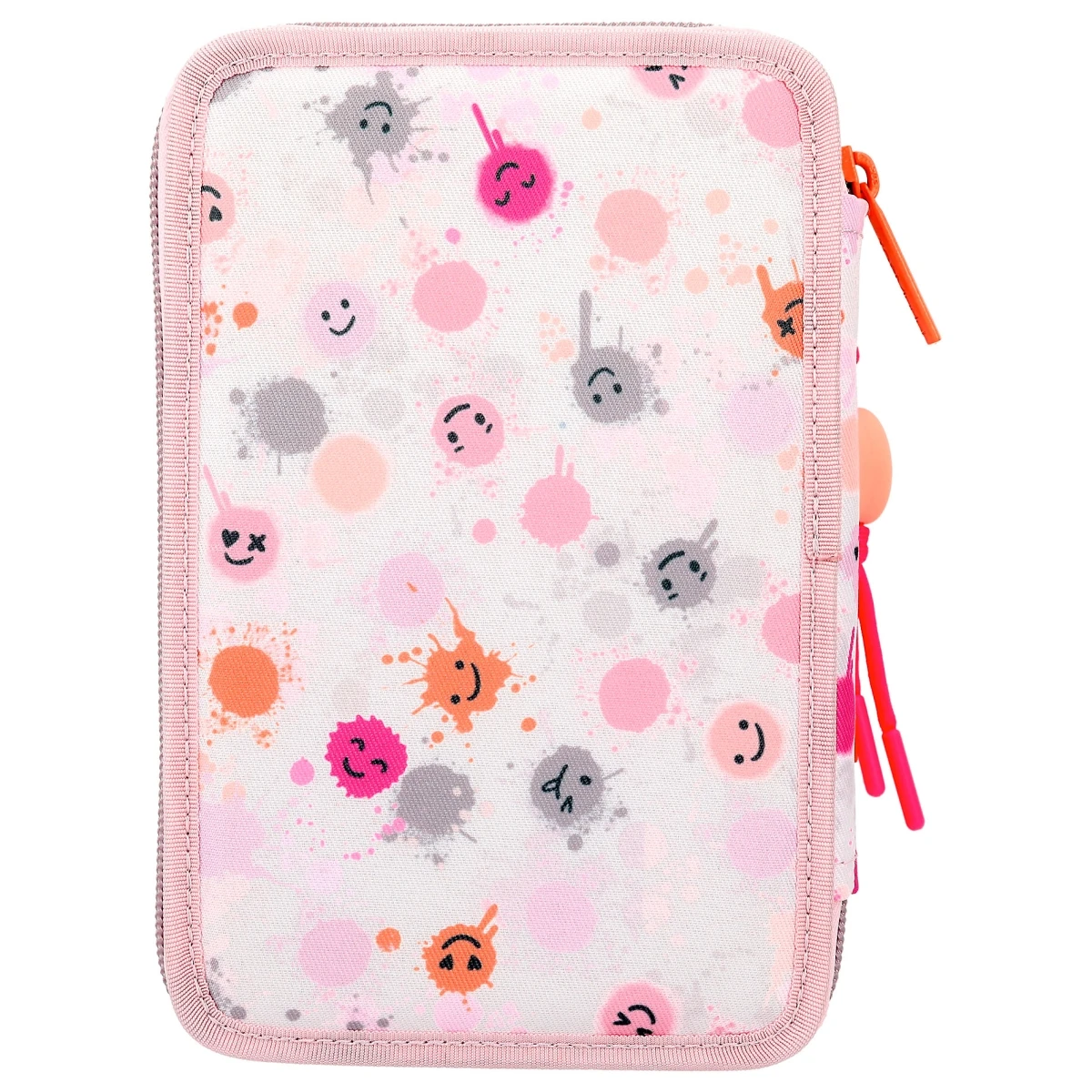Megasüß: der Smiley-Anhänger am Reißverschluss. Die drei separaten Fächer sind komplett gefüllt mit je 18 Bunt- und Filzstiften, 2 Bleistiften, Anspitzer, Radierer, Lineal, Schere und Klebestift.