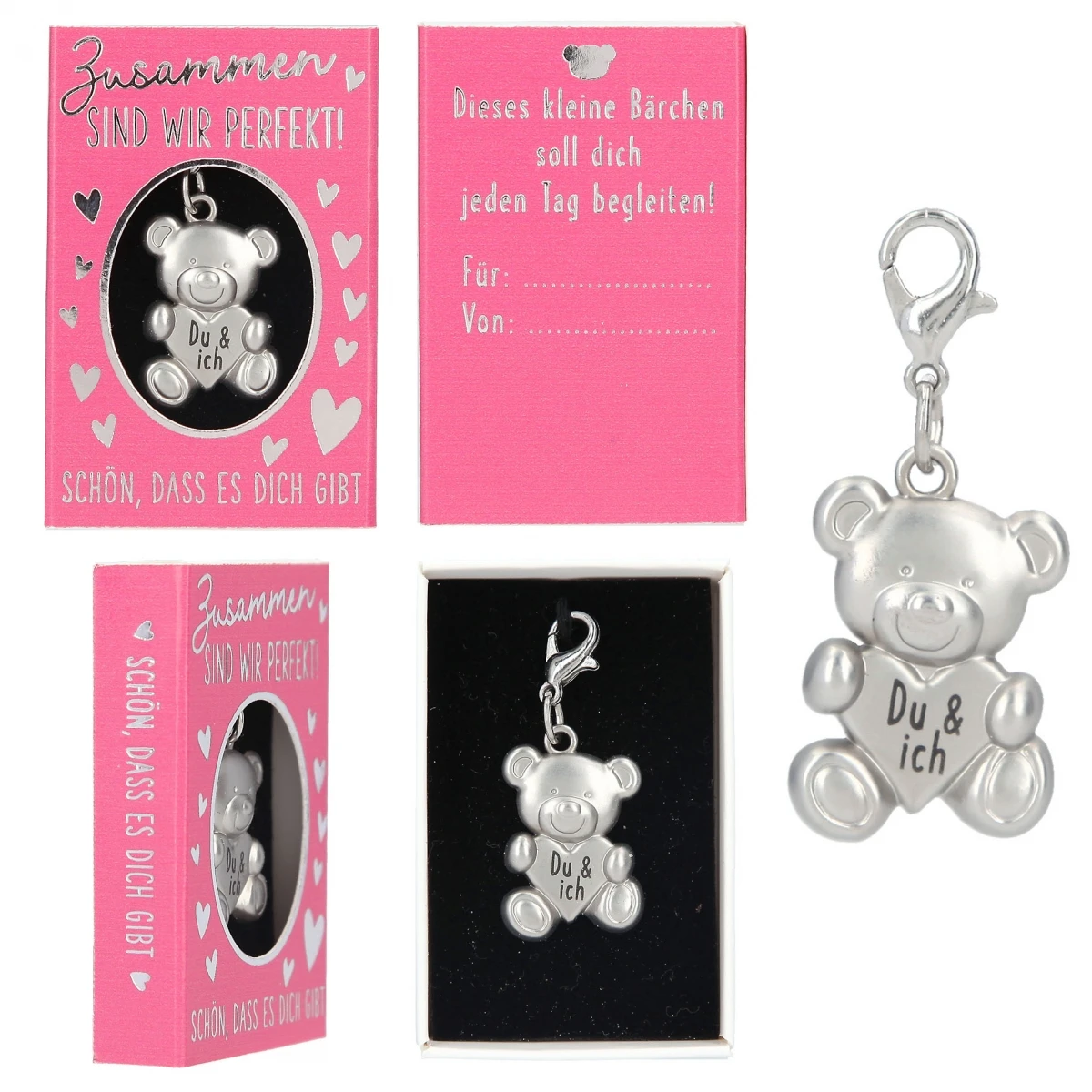 Kleine Begleiter für die Schlüssel und ihre Besitzer(in): Die niedlichen silbernen Anhänger in Teddyform (Zinklegierung) mit Mini-Karabiner haben verschiedene herzige Texte.