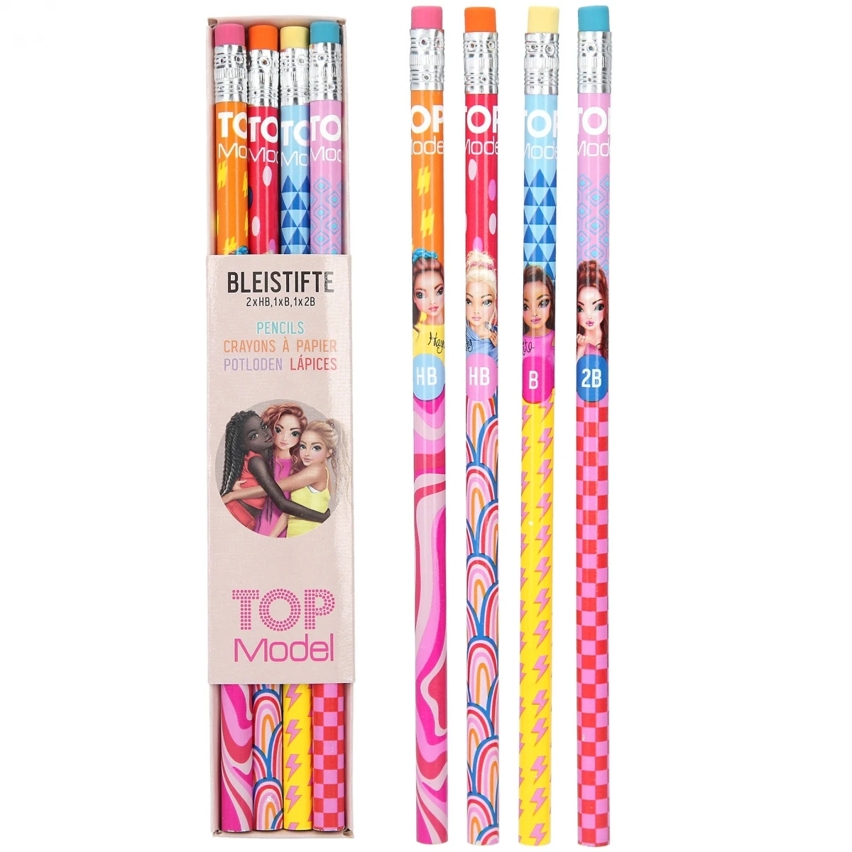 4 Bleistifte (Härtegrade: 2x HB, 1x 2B, 1x B) mit bunten Trend-Mustern, farbigen Radiergummis und natürlich den TOPModels.