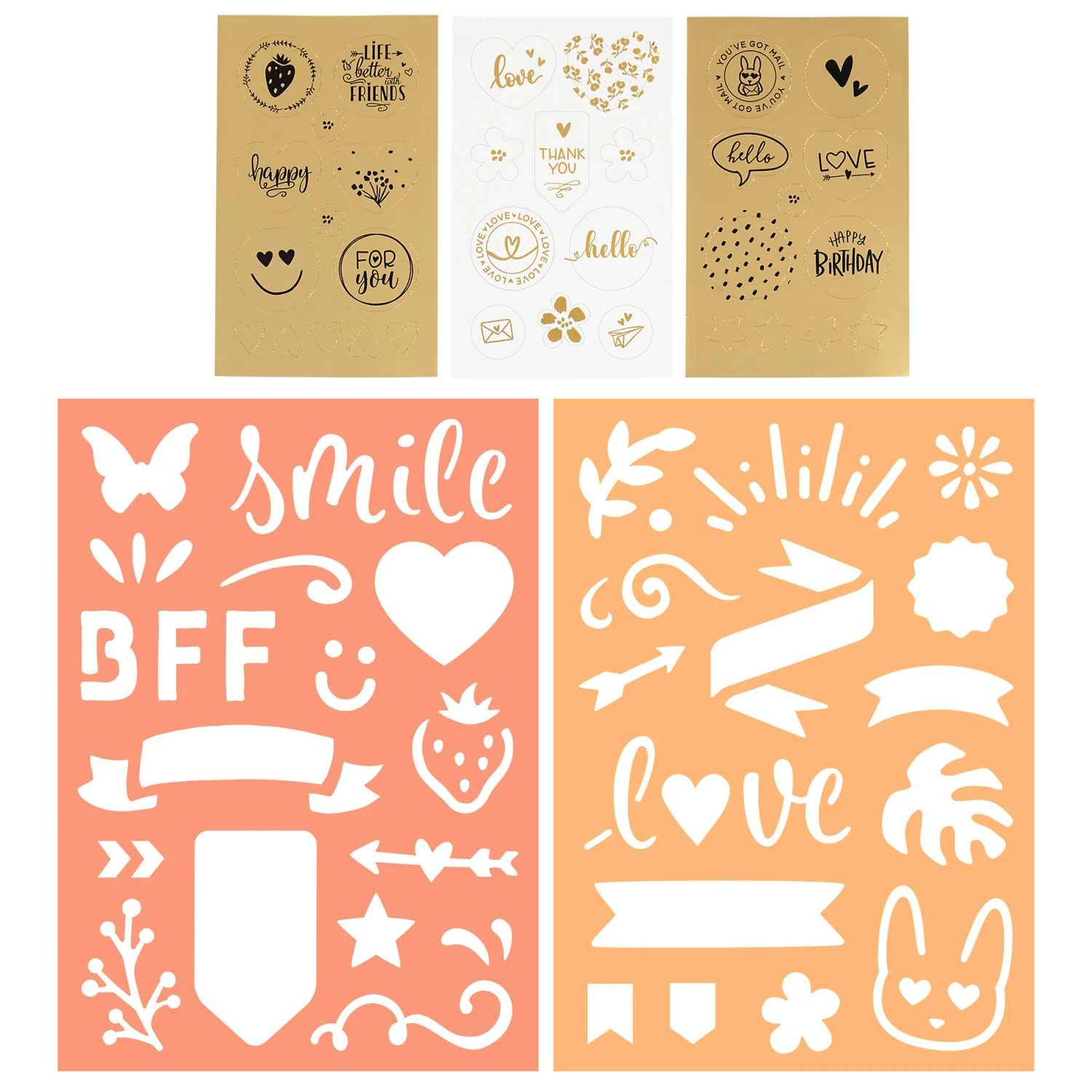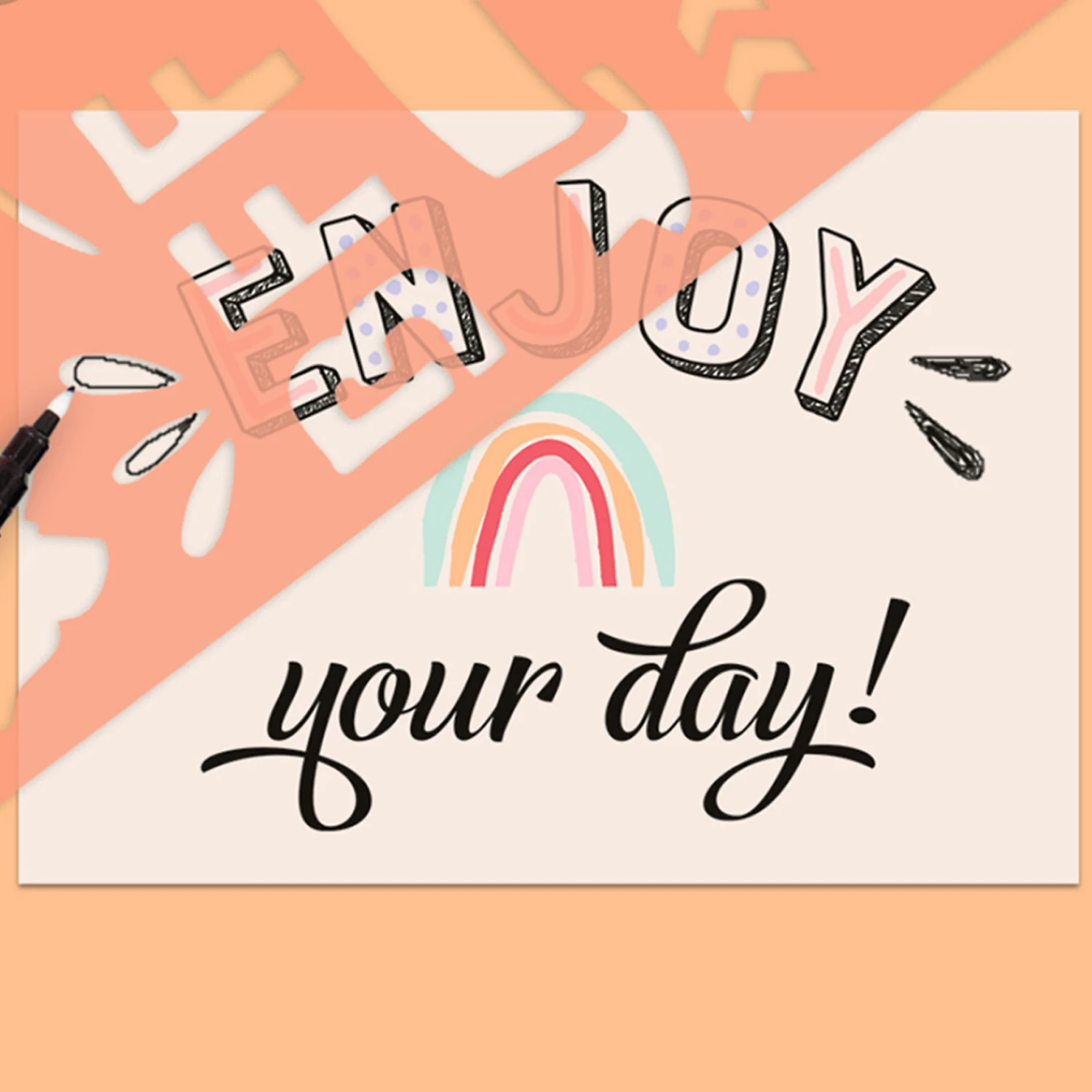 10 Briefblätter, 3 Stickerbögen (2x gold, 1x weiß), 5 Postkarten, 10 Briefumschläge, 1 Abroller mit 4 hübschen Tape-Rollen, 4 Stifte (1 Magic Handlettering Stift, 3 Doppelfasermaler in Schwarz, Neon-Pink und Pastell-Lila), 2 Schablonen und 1 Büchlein mit einfachen Anleitungen.