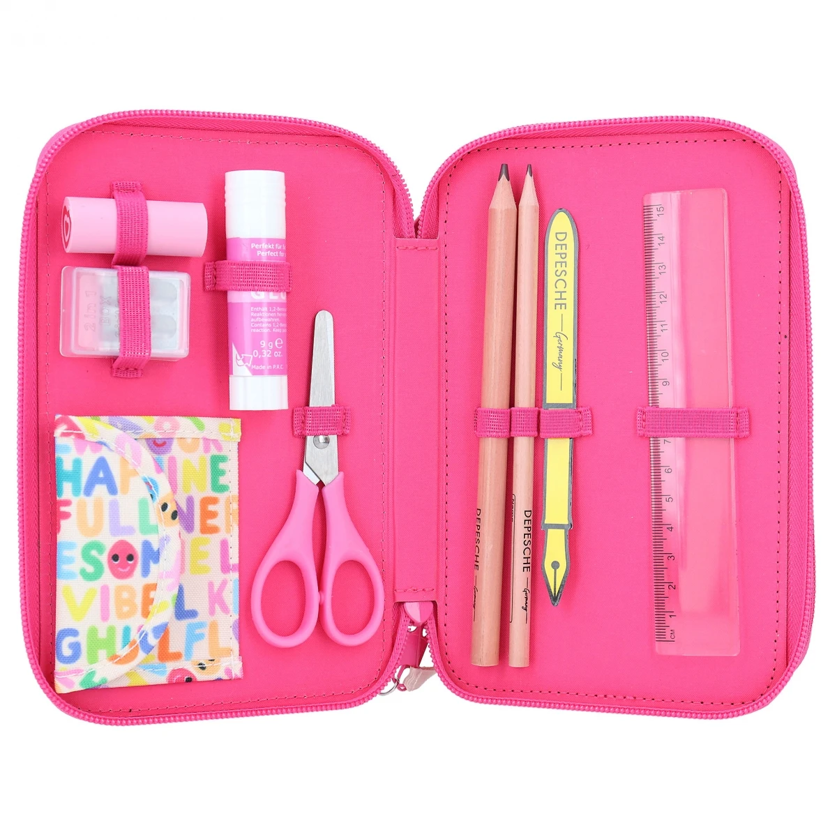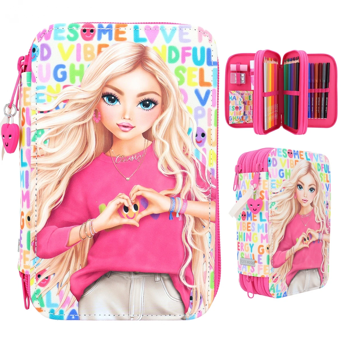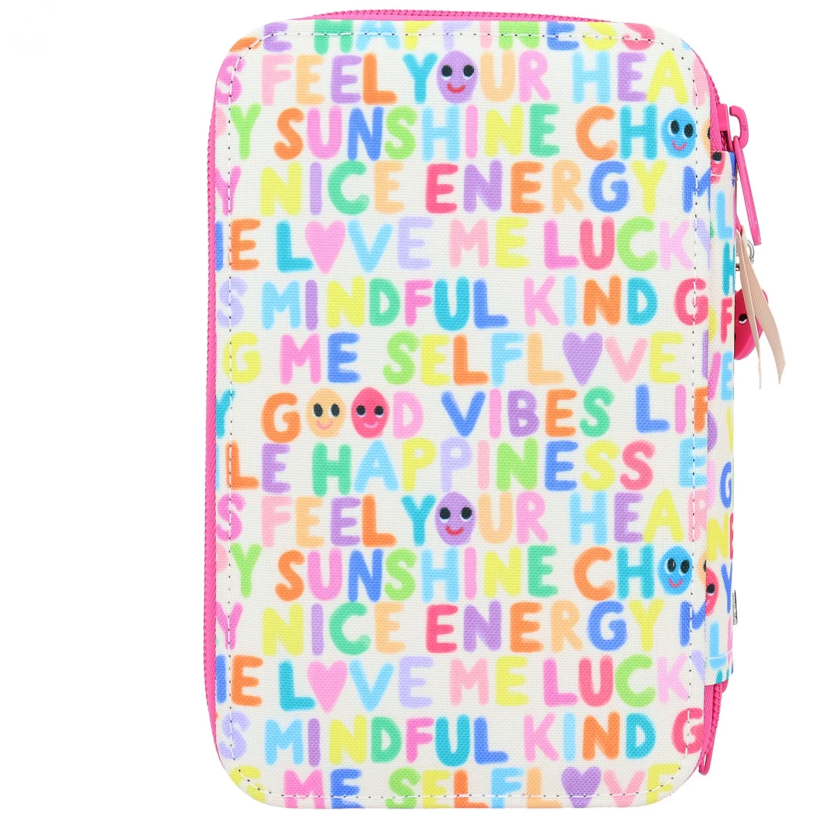 Die Federtasche aus der TOPModel-Serie Selflove ist ein fröhliches Farb-Spektakel mit einem coolen Model-Print auf der Front und einem superhippen Schrift-Allover voller Wohlfühl-Wörter.