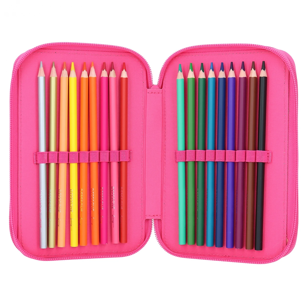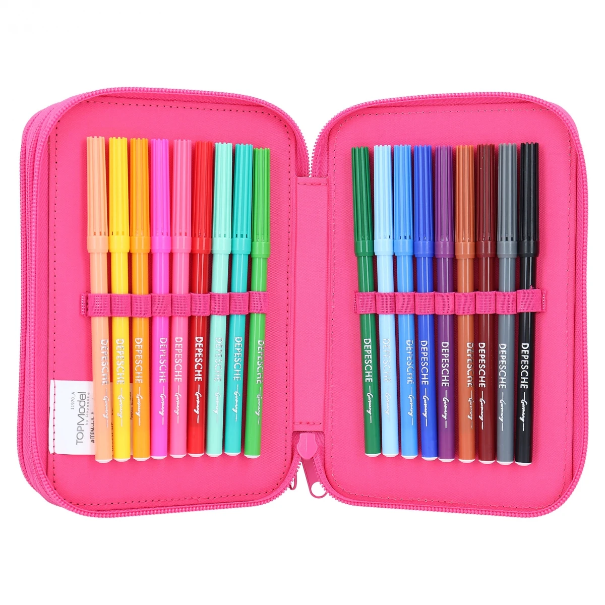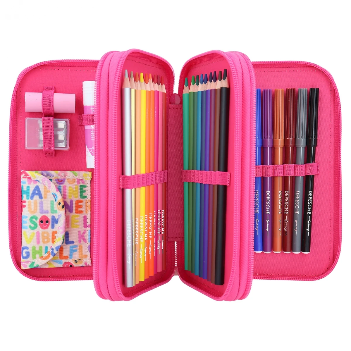 Die drei separaten Fächer sind komplett gefüllt mit 18 Filzstiften, 18 Buntstiften (Neu: verbesserte Holzqualität und dickere, stabilere Mine), 2 Bleistiften, Anspitzer, Radierer, Lineal, Schere und Klebestift.