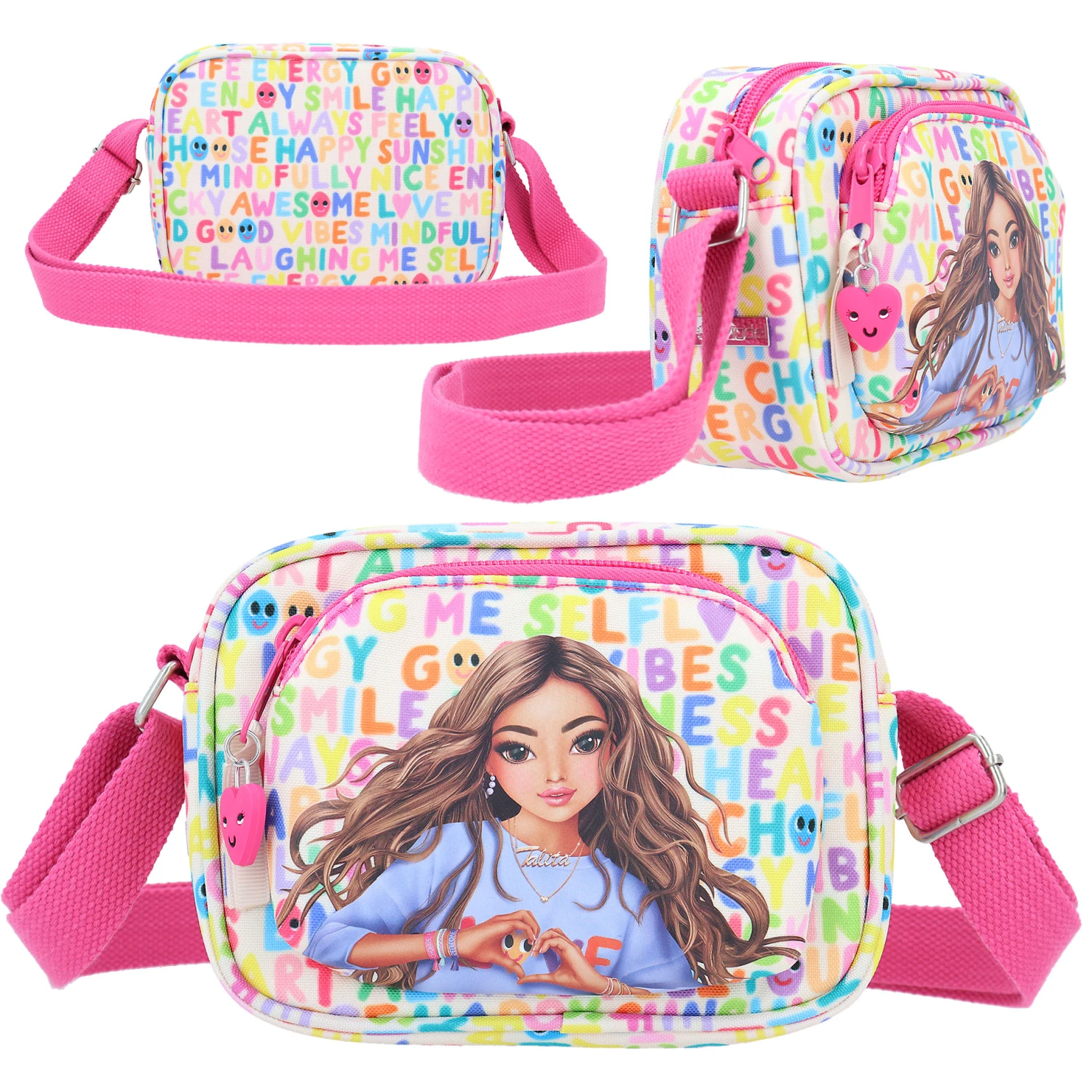 Die kleine Umhängetasche aus der TOPModel-Serie Selflove ist ein fröhliches Farb-Spektakel mit einem coolen Model-Print auf der Front und einem superhippen Schrift-Allover voller Wohlfühl-Wörter.