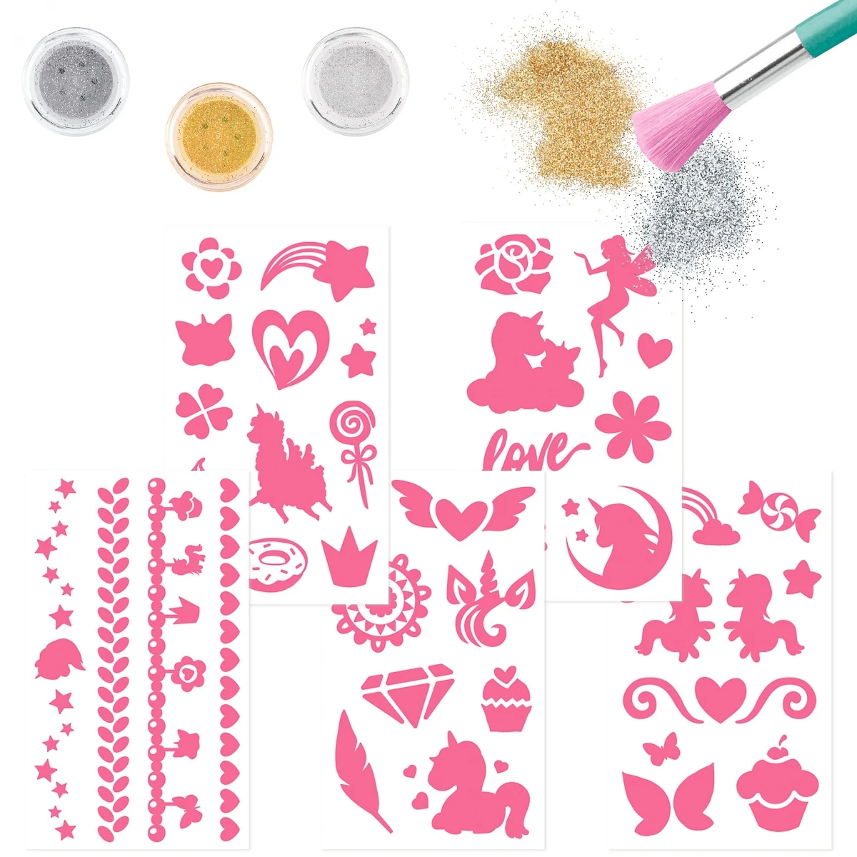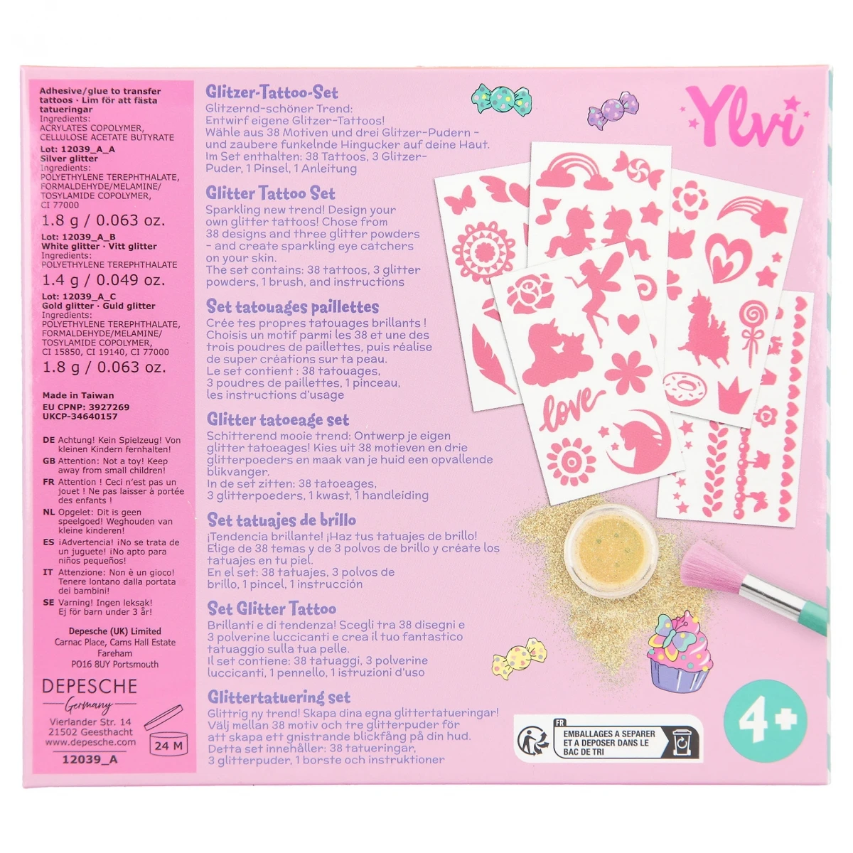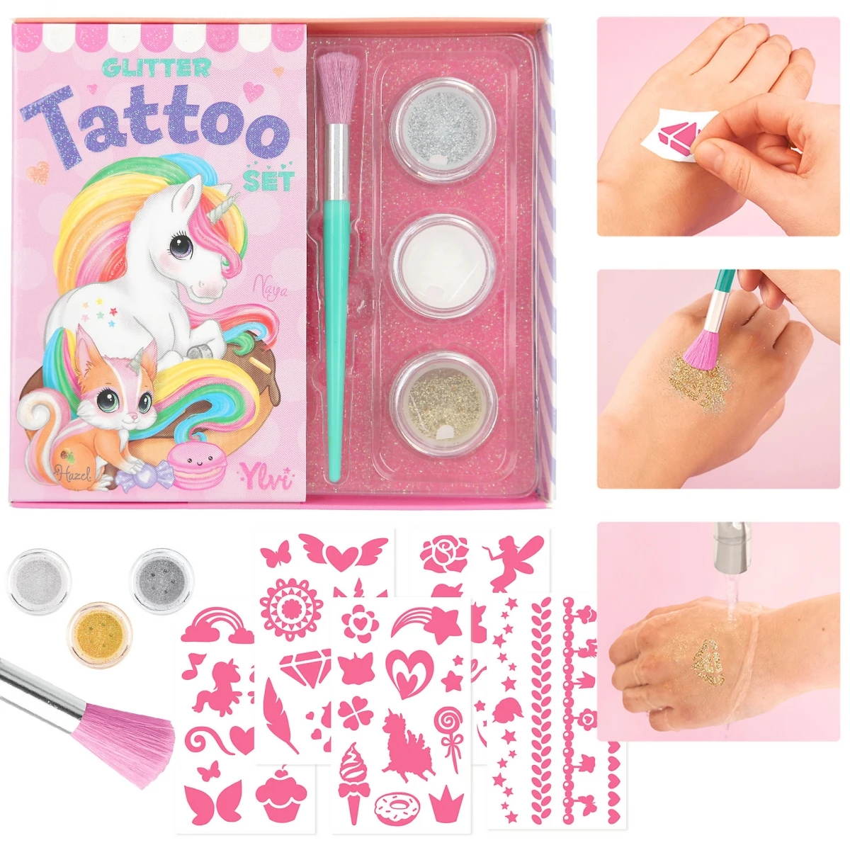 Einhörner, Herzen, Kronen, Sterne und noch viel mehr: Das Glitzer-Tattoo-Set von Ylvi beinhaltet 38 zauberhaft schöne Klebetattoos, 3 Glitzer-Puder (Silber, Gold, Weiß) und einen weichen Pinsel. Für echte Hingucker auf der Haut!