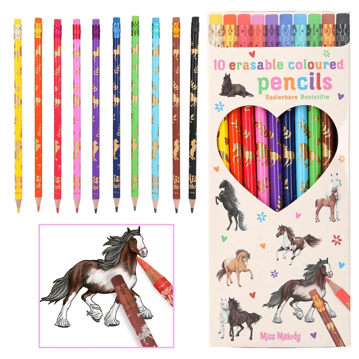 So bunt und so gut wieder zu entfernen: Die radierbaren Buntstifte von Miss Melody haben einen jeweils farblich passenden Radierer-Topper. Zum Set gehören 10 Stifte: gelb, orange, rot, pink, lila, dunkelblau, hellblau, grün, braun und schwarz. V