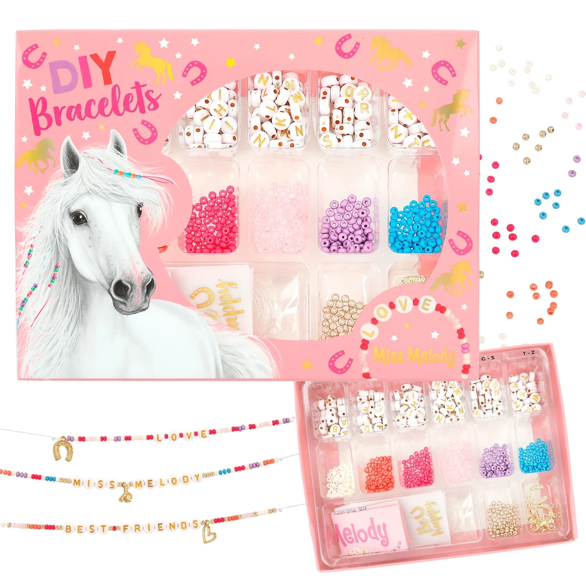 Zu dem Bastel-Set von Miss Melody gehören 490 kleine bunte Perlen in Cremeweiß, Koralle, Pink, Rosa, Lavendel, Blau und Gold sowie 207 Buchstaben-Perlen, 6 niedliche Metall-Anhänger (Pferde, Herzen, Hufeisen), 2 Meter elastisches Band und 3 kleine Geschenk-Tütchen.