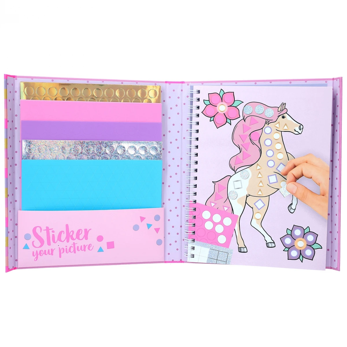 Sticker your picture: In dem Kreativbuch von Miss Melody mit Spiralbindung und Magnetverschluss kann man wunderschöne Pferdebilder mit farblich passenden Stickern und Folien vervollständigen.
