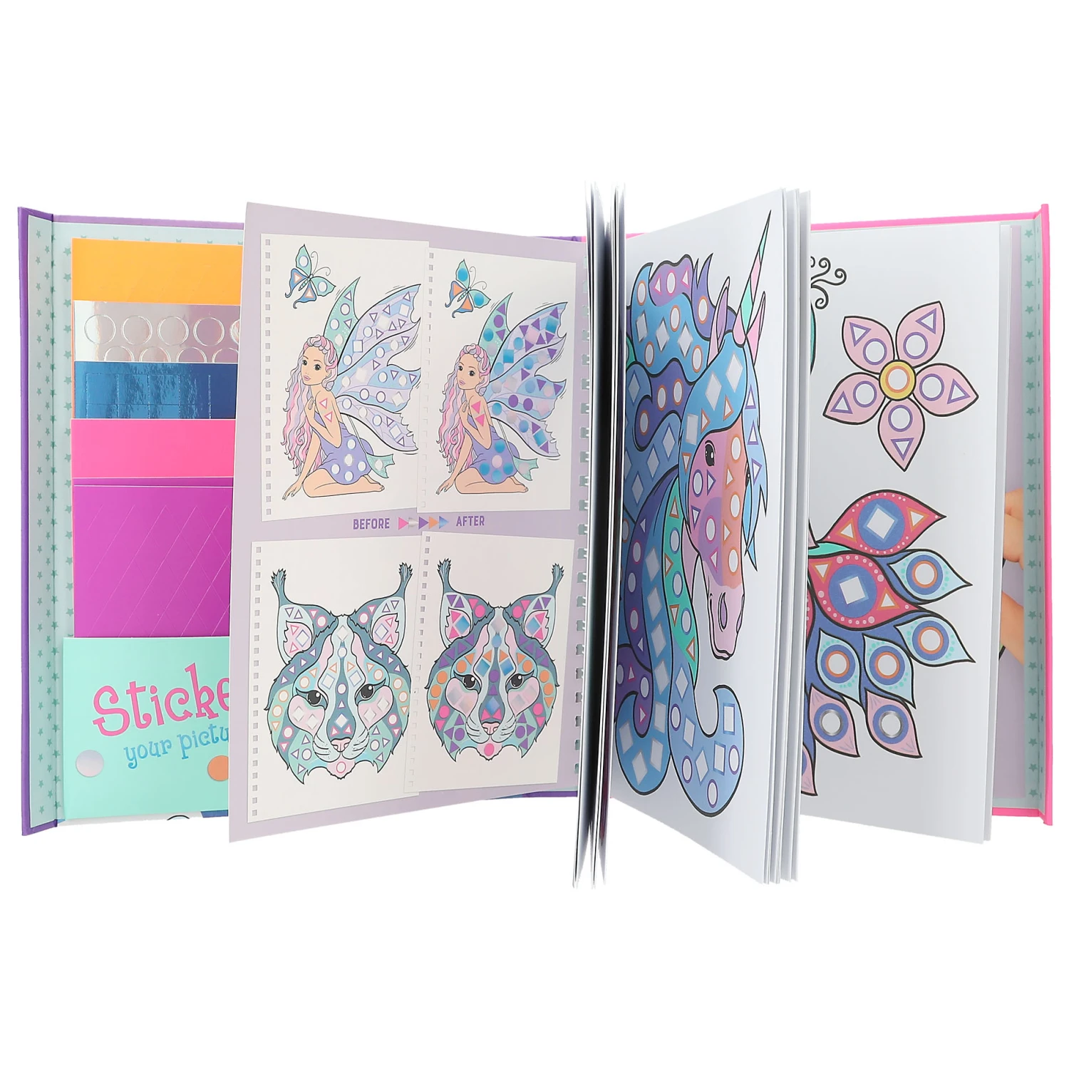 Das sind 25 Seiten mit Motiven von magisch schönen Wesen und fantastischen TOPModel-Figurinen, die man mit 10 Stickerbogen in verschiedenen Farben und Formen komplettieren und damit einzigartig machen kann.