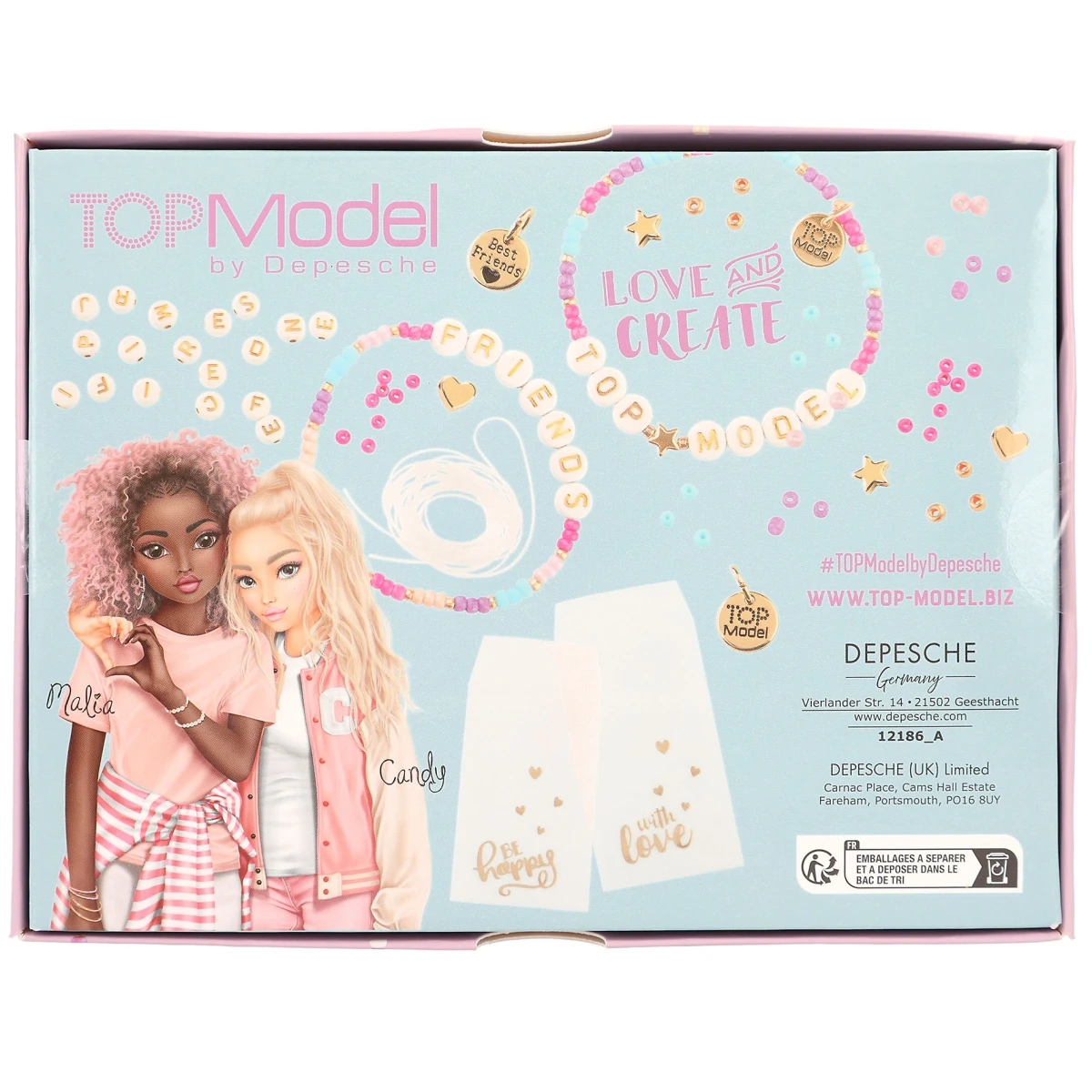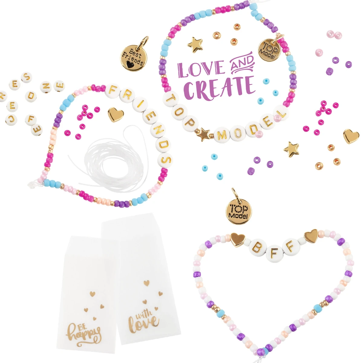 490 kleine bunte Perlen in Weiß, Pink, Apricot, Rosé, Lila, Türkis und Gold sowie 207 Buchstaben-Perlen, 6 goldene Metall-Anhänger und 3 kleine Geschenk-Tüten mit goldenem Aufdruck.