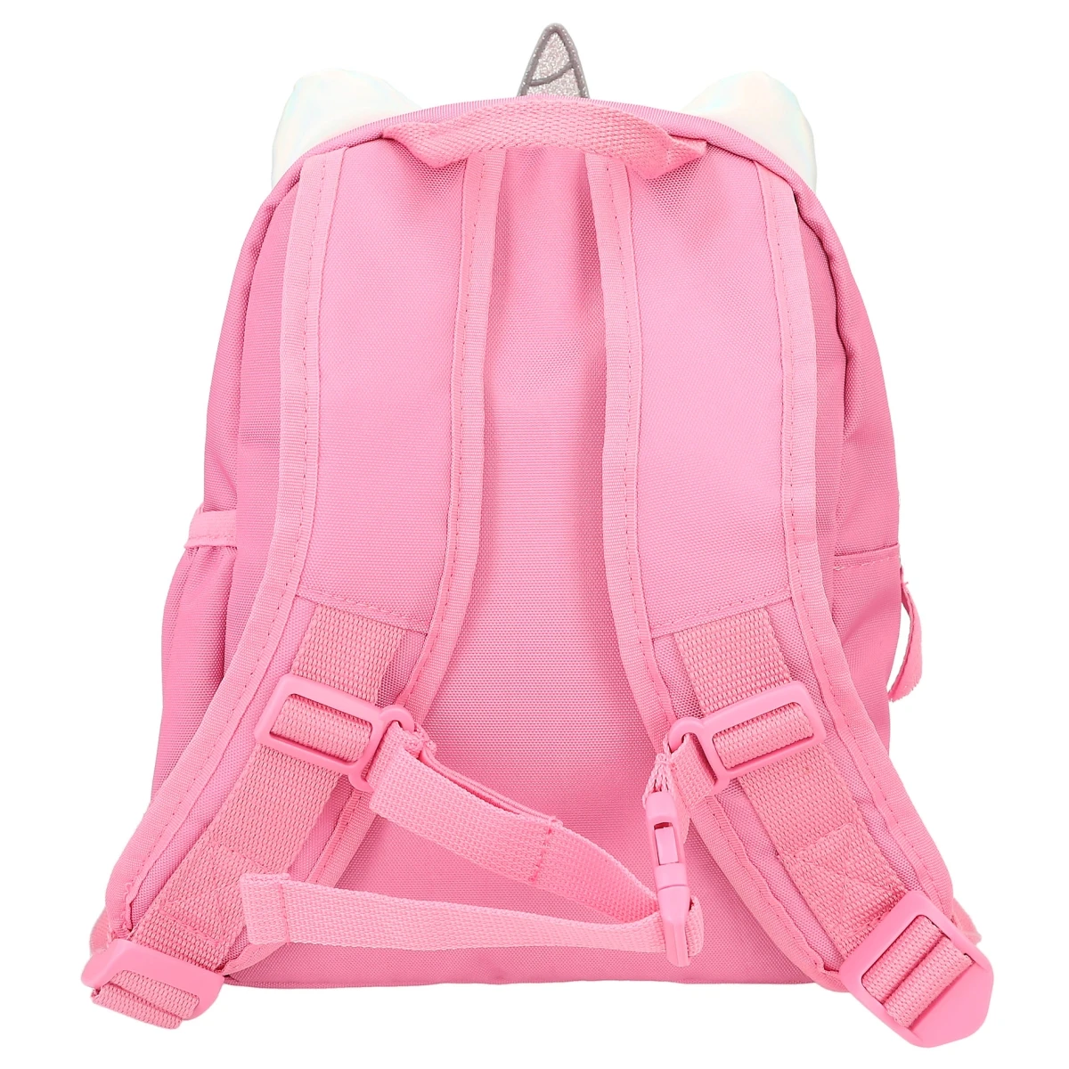 Der kleine, pinke Rucksack in Einhorn-Form mit tollen Glitzer-Details hat zwei Reißverschluss-Fächer und eine Seitentasche für die Trinkflasche.
