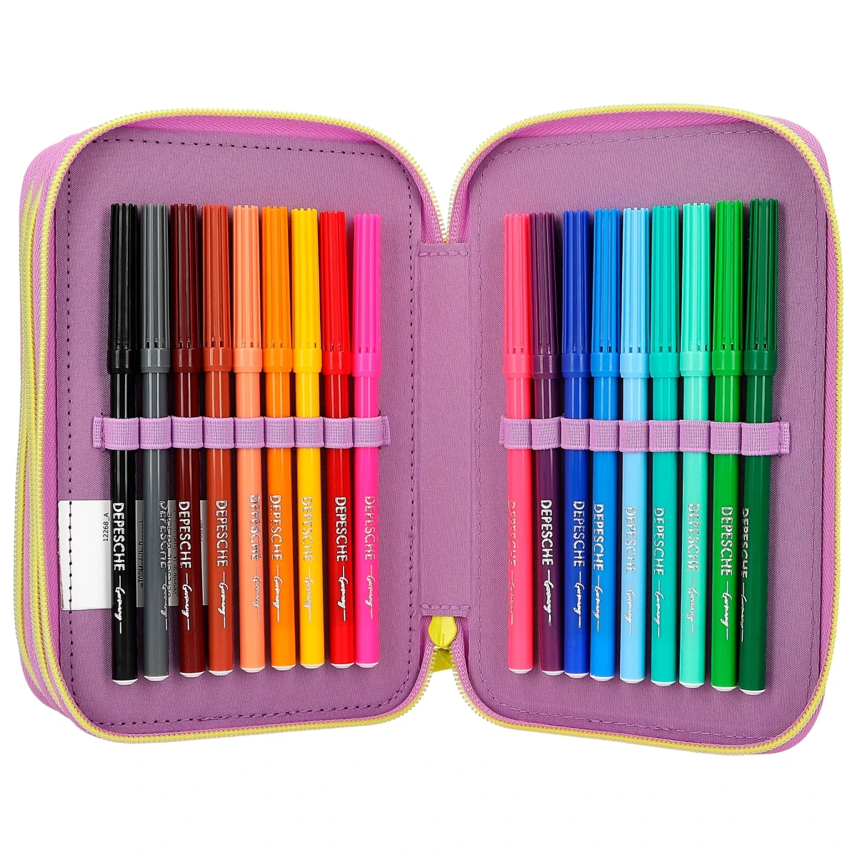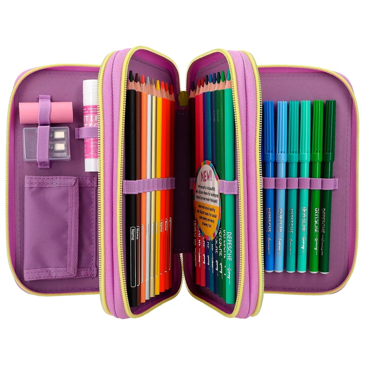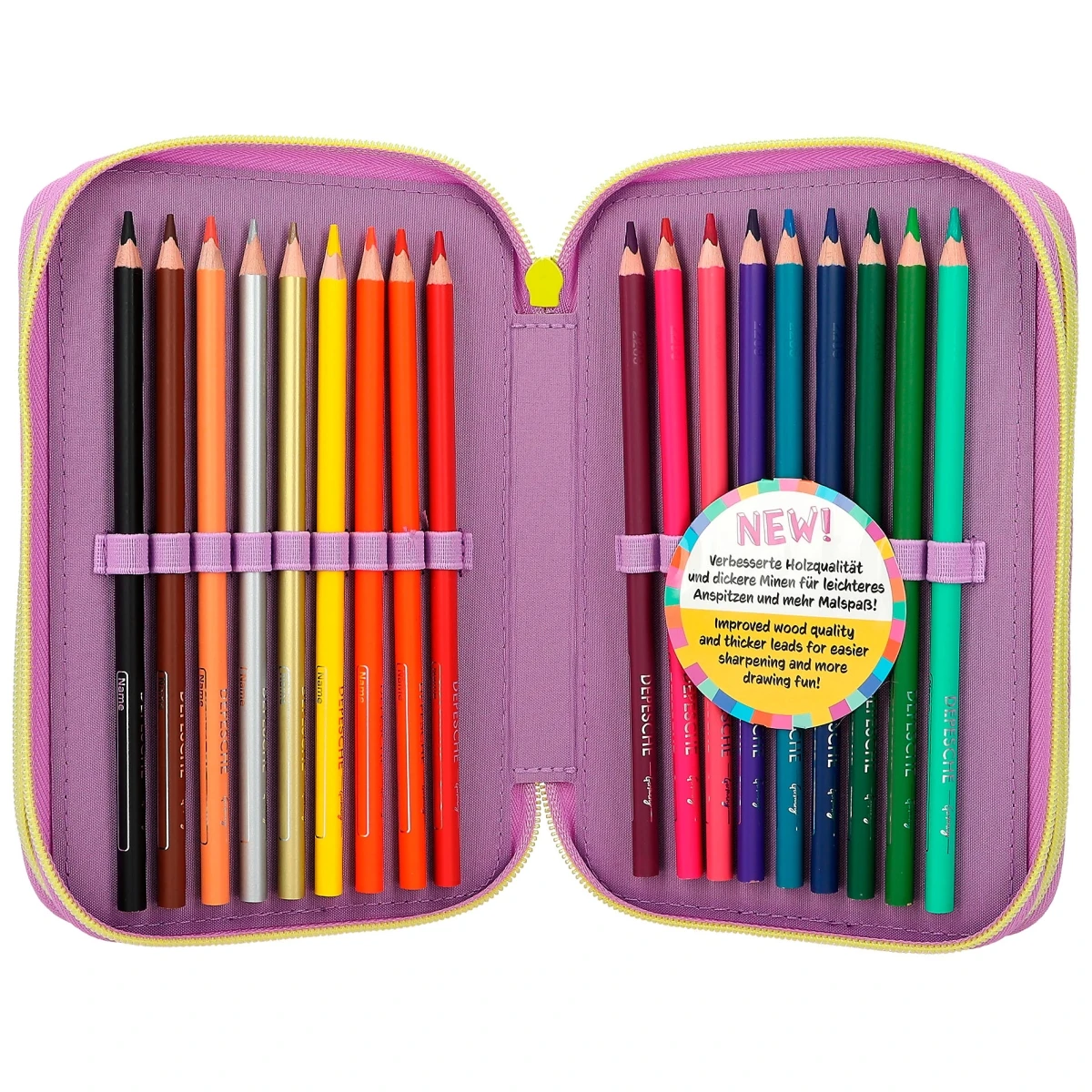 In angesagter, farbenfroher Colourblock-Optik. Die drei separaten Fächer sind komplett gefüllt mit je 18 Bunt- und Filzstiften, 2 Bleistiften, Lineal, Anspitzer, Radierer, Schere, Klebestift und einer kleinen Klett-Tasche.
