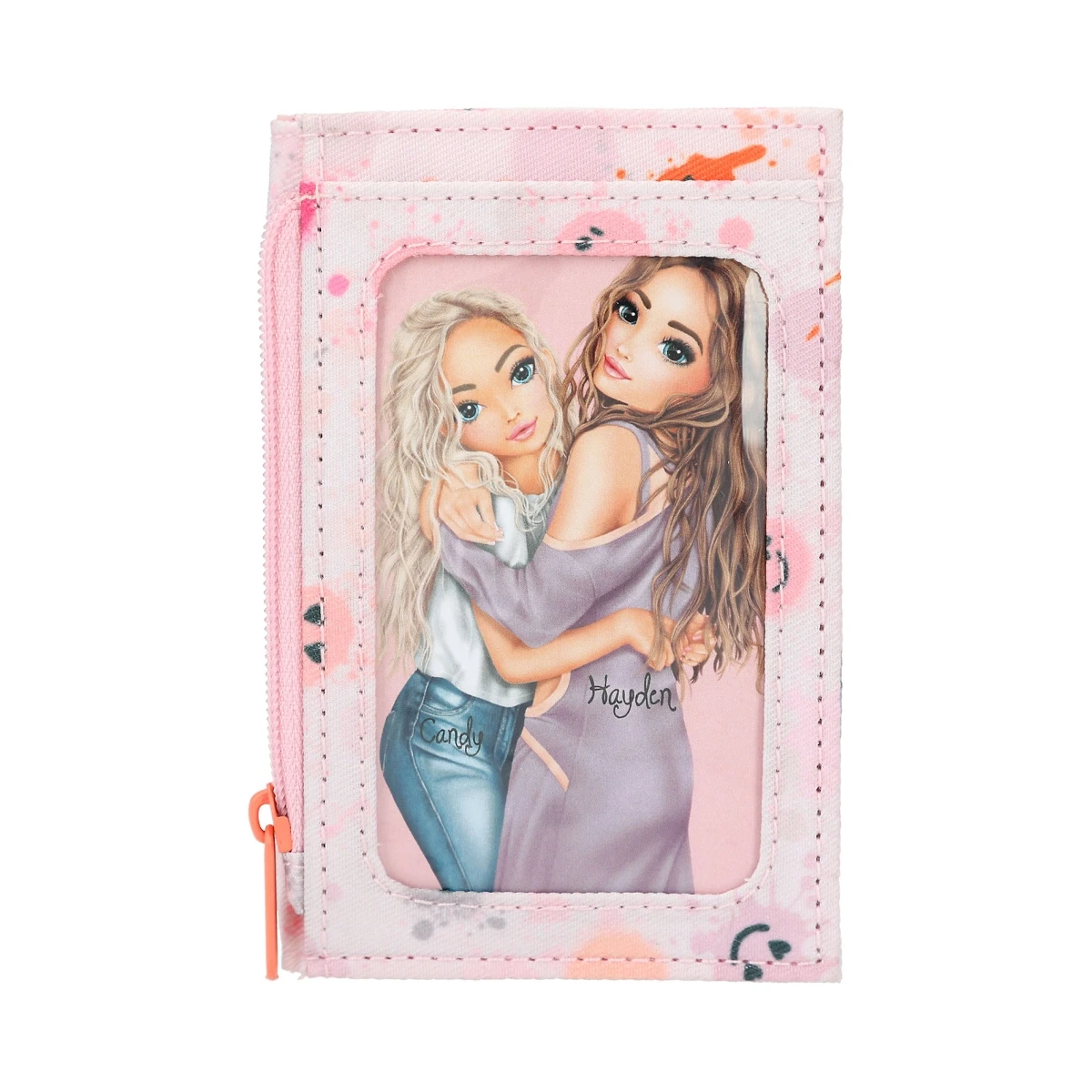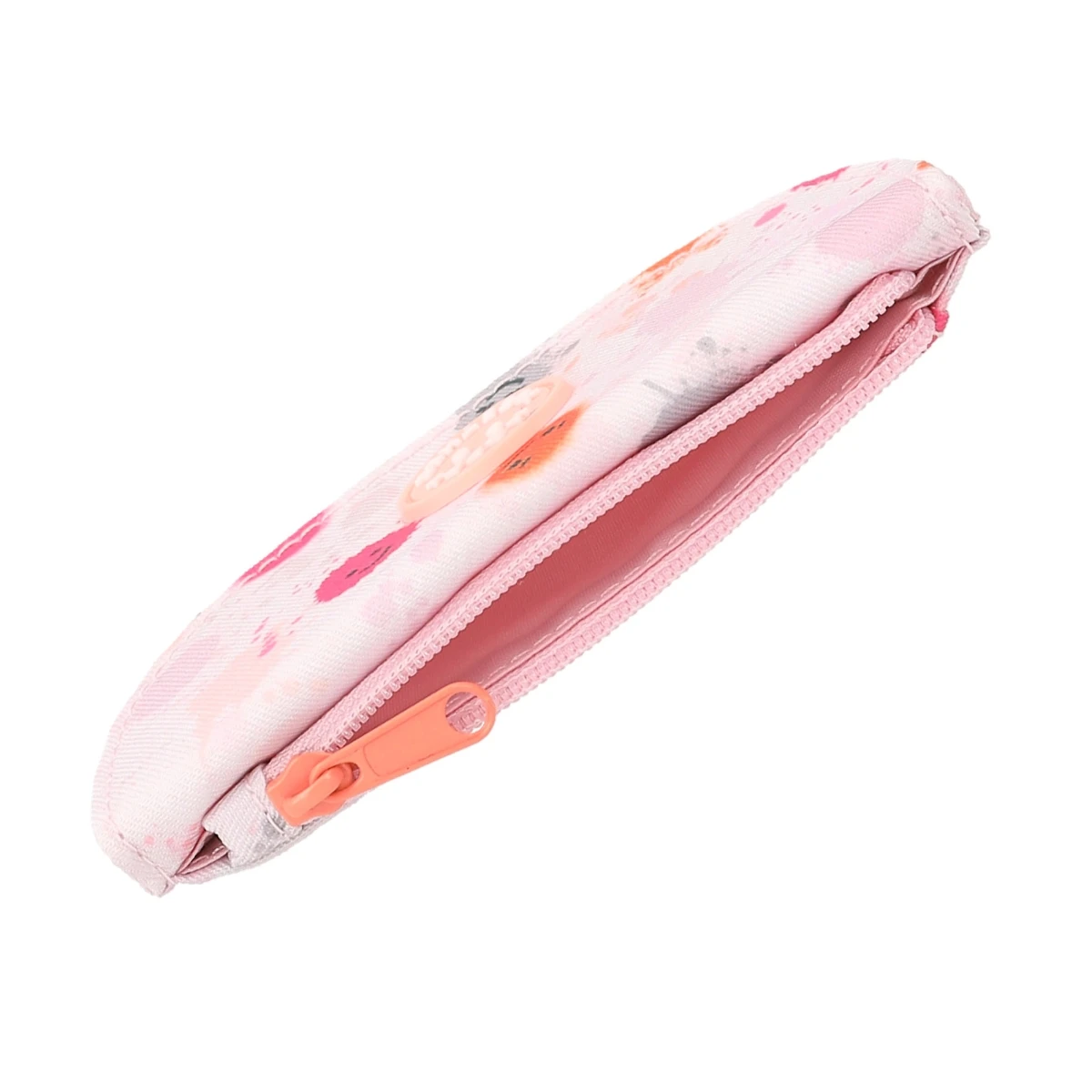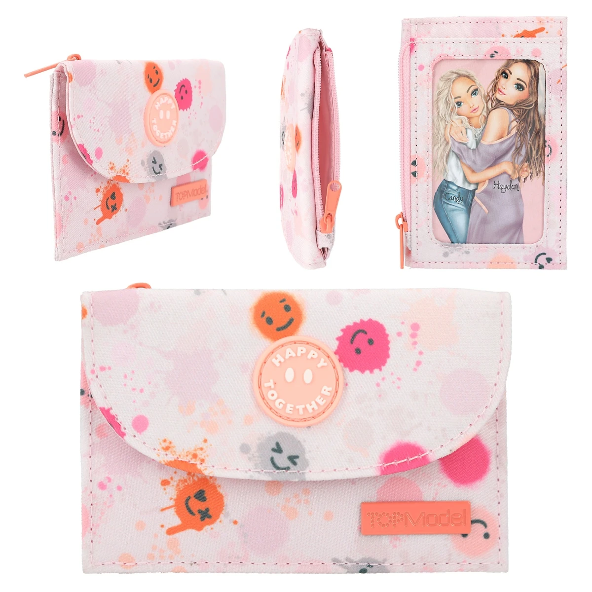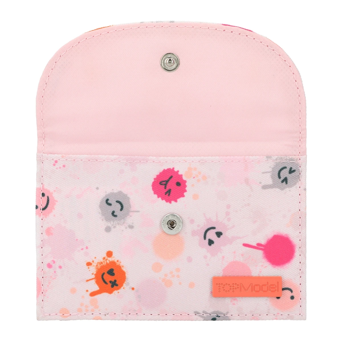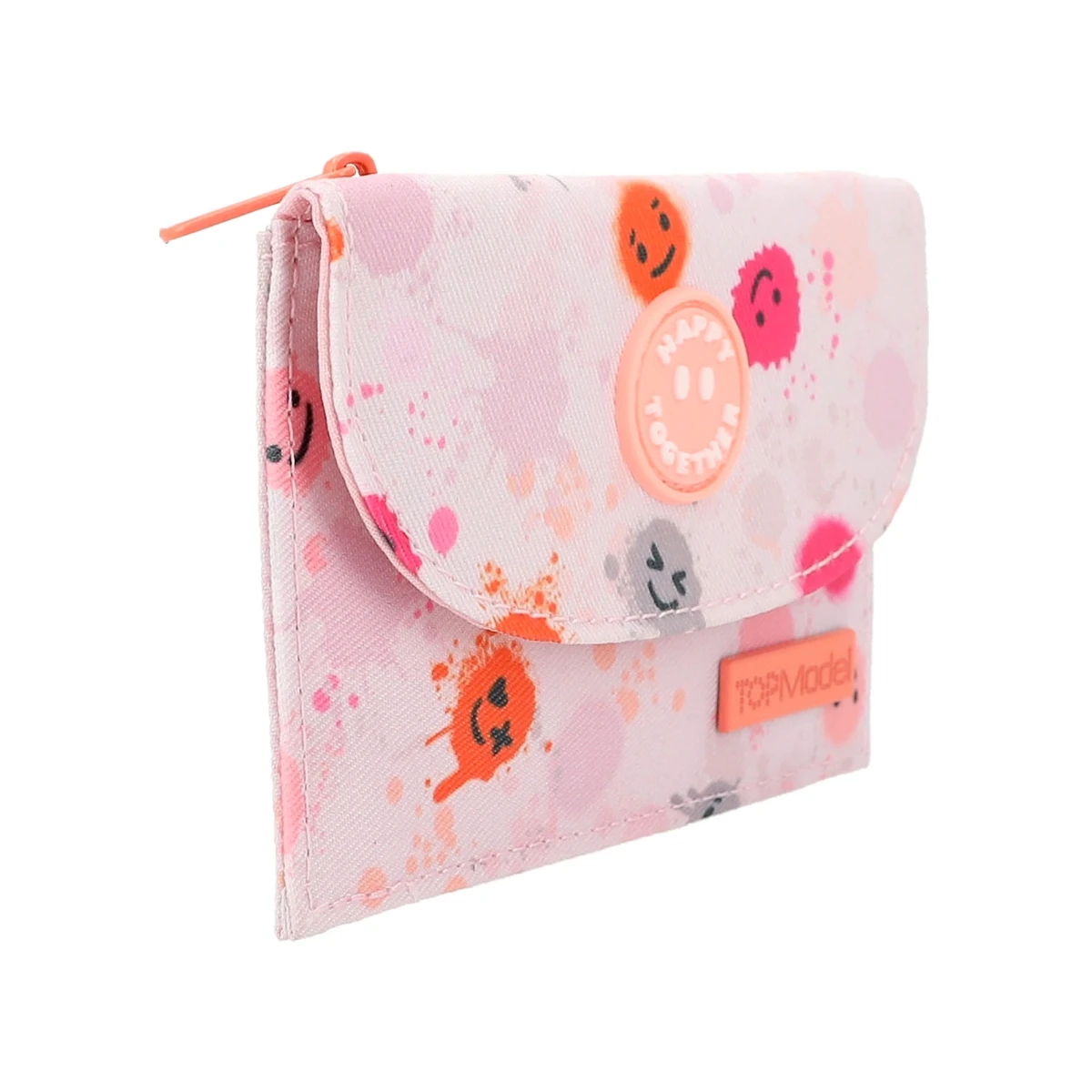 Das kleine Portemonnaie macht gute Laune: zartes Rosa, überall fröhliche Klecks-Smileys und ein niedliches Smiley-Patch vorne.