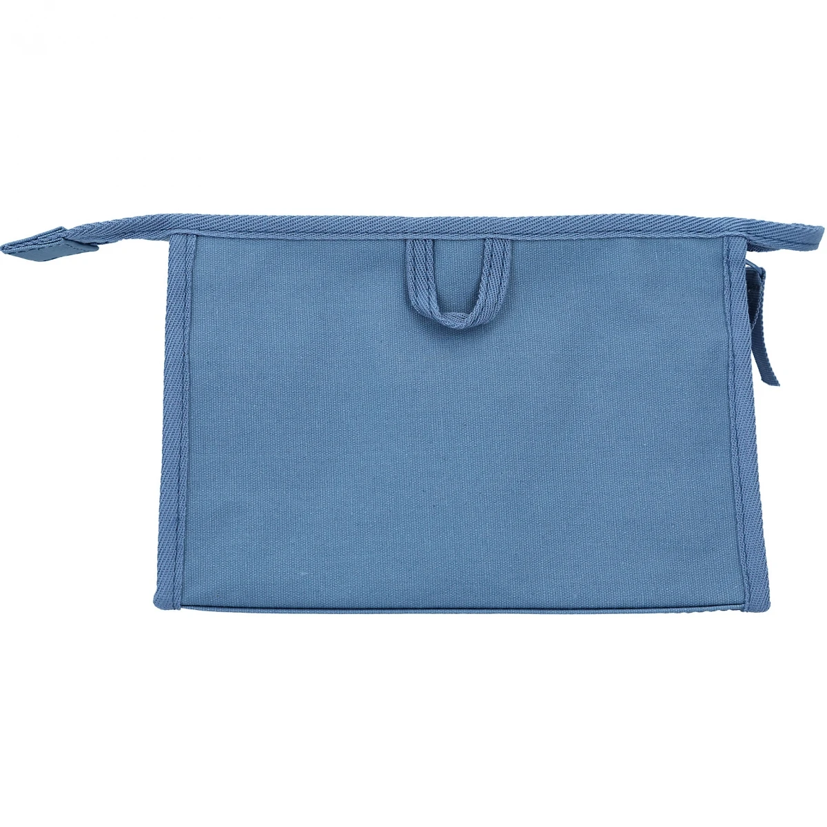 Dino-starke blaue Waschtasche von Dino World Mini mit aufgesetztem blauem Frottee-Saurier vor dessen Maul ein Knochen-Anhänger baumelt.