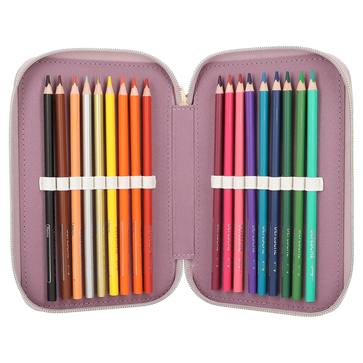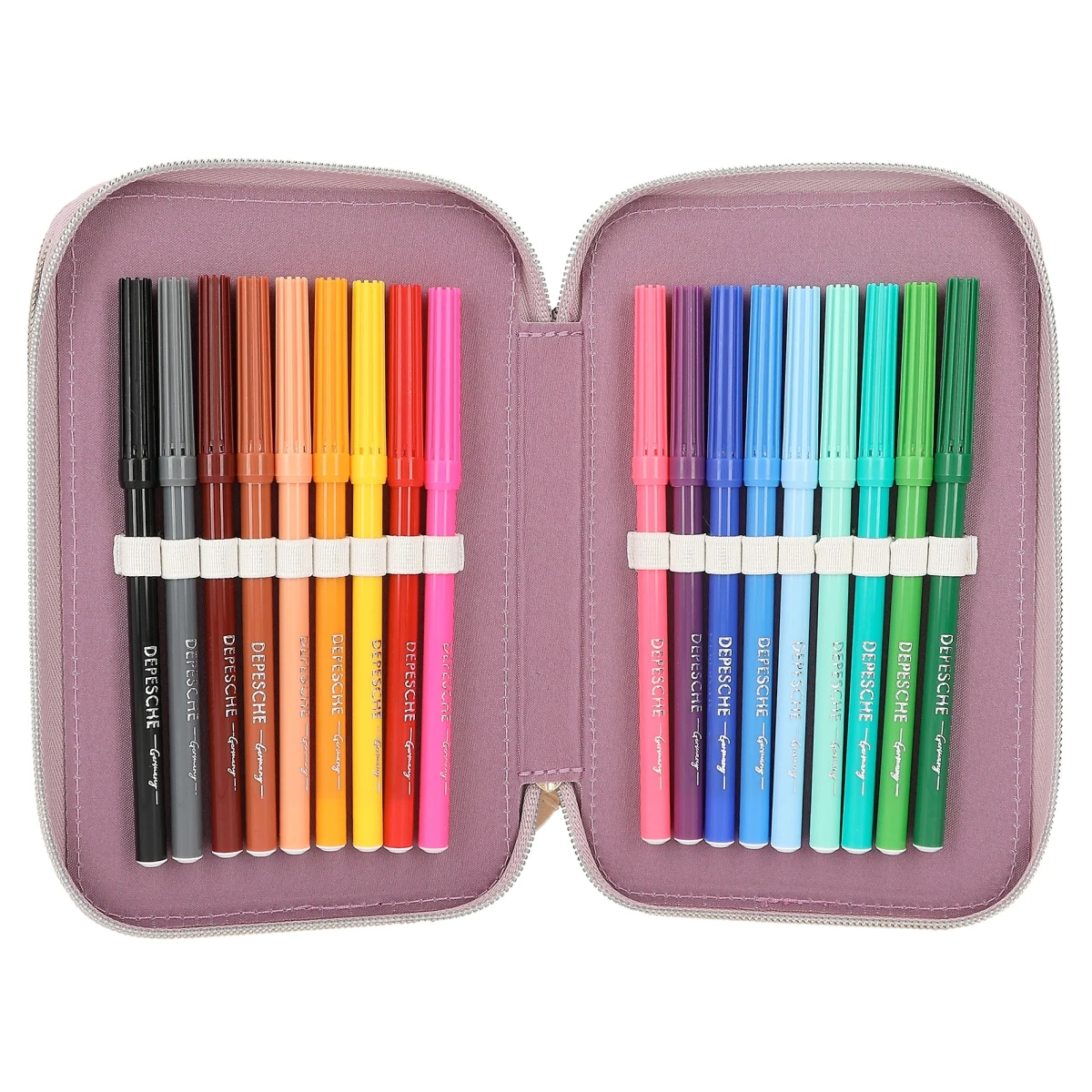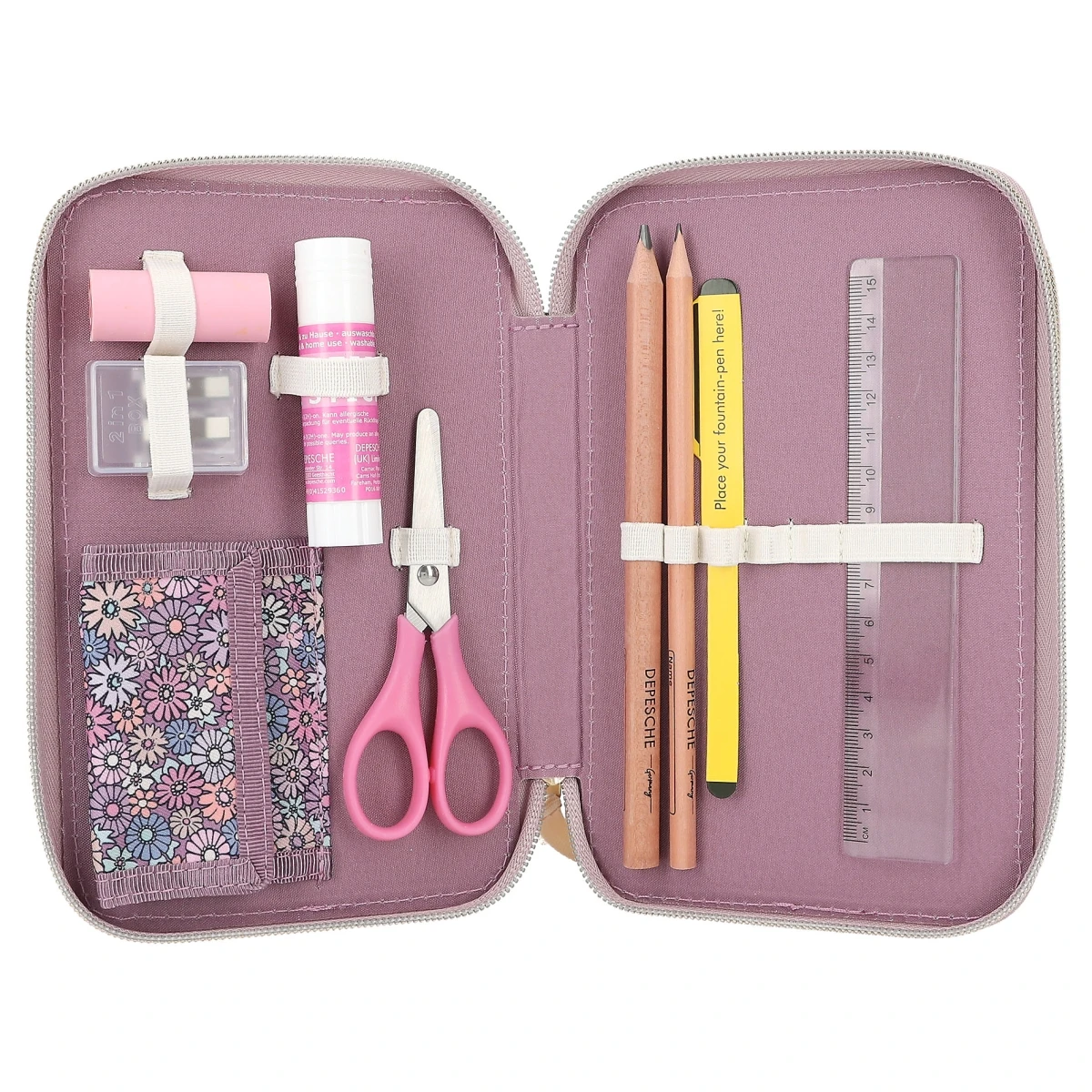 Die drei separaten Fächer sind komplett gefüllt mit je 18 Bunt- und Filzstiften, 2 Bleistiften, Lineal, Anspitzer, Radierer, Schere, Klebestift sowie einem kleinen Klett-Täschchen.