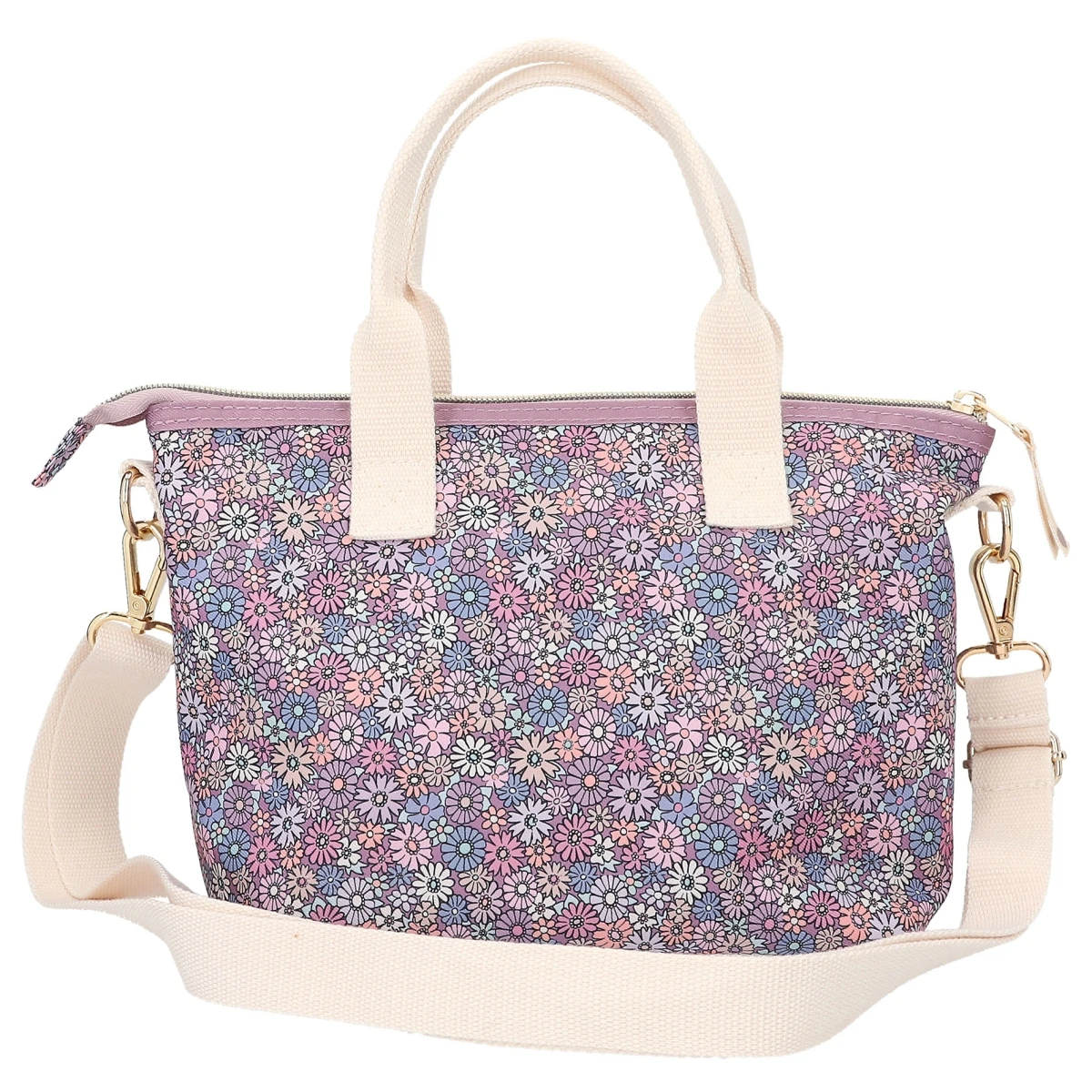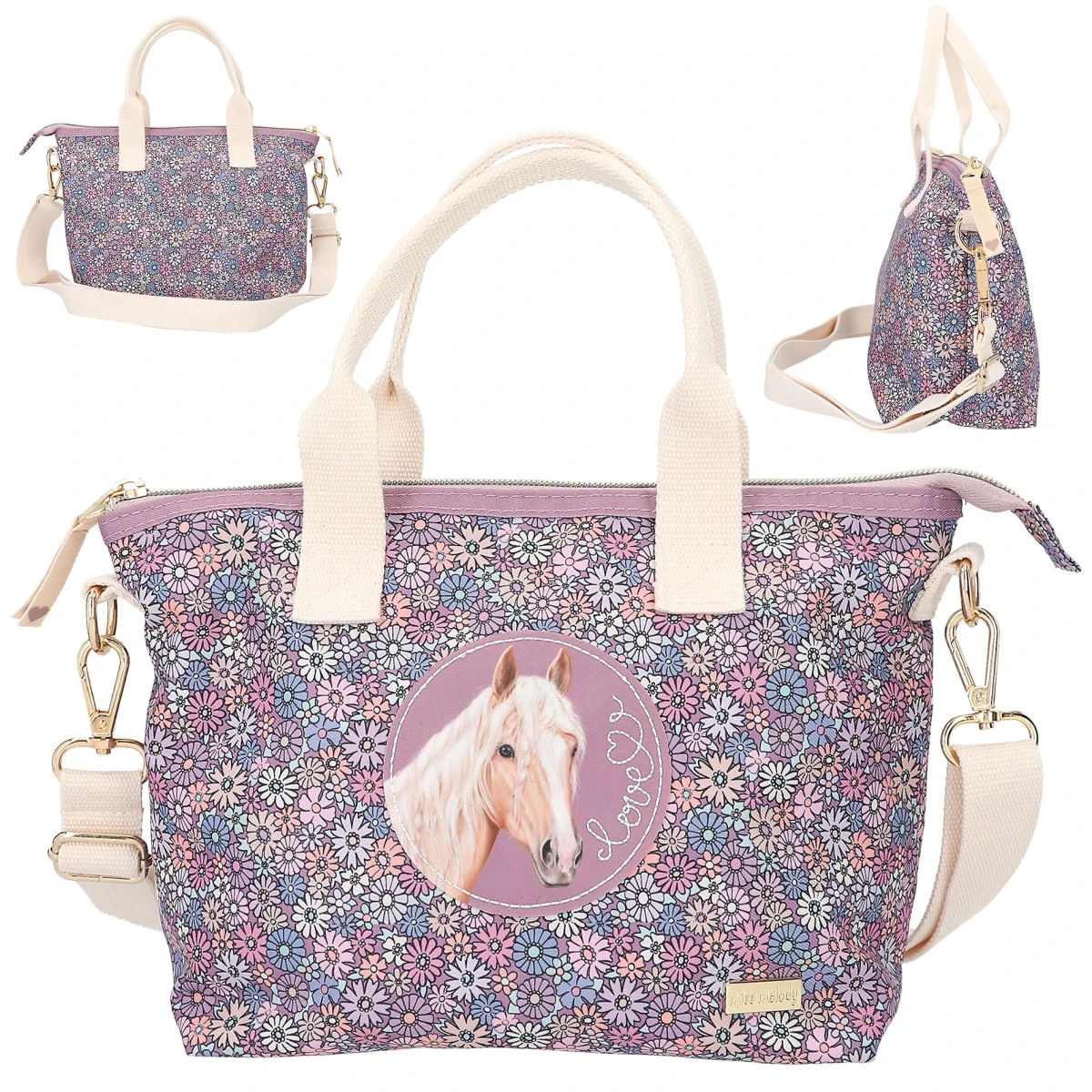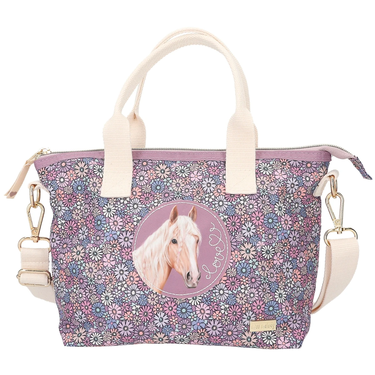 Die kleine Shopper-Tasche von Miss Melody ist über und über mit einem wunderhübschen Blumen-Allover bedruckt, das zum rauchigen Lila der Reißverschluss-Kanten und des niedlichen Pferde-Patches mit Love-Stickerei passt.