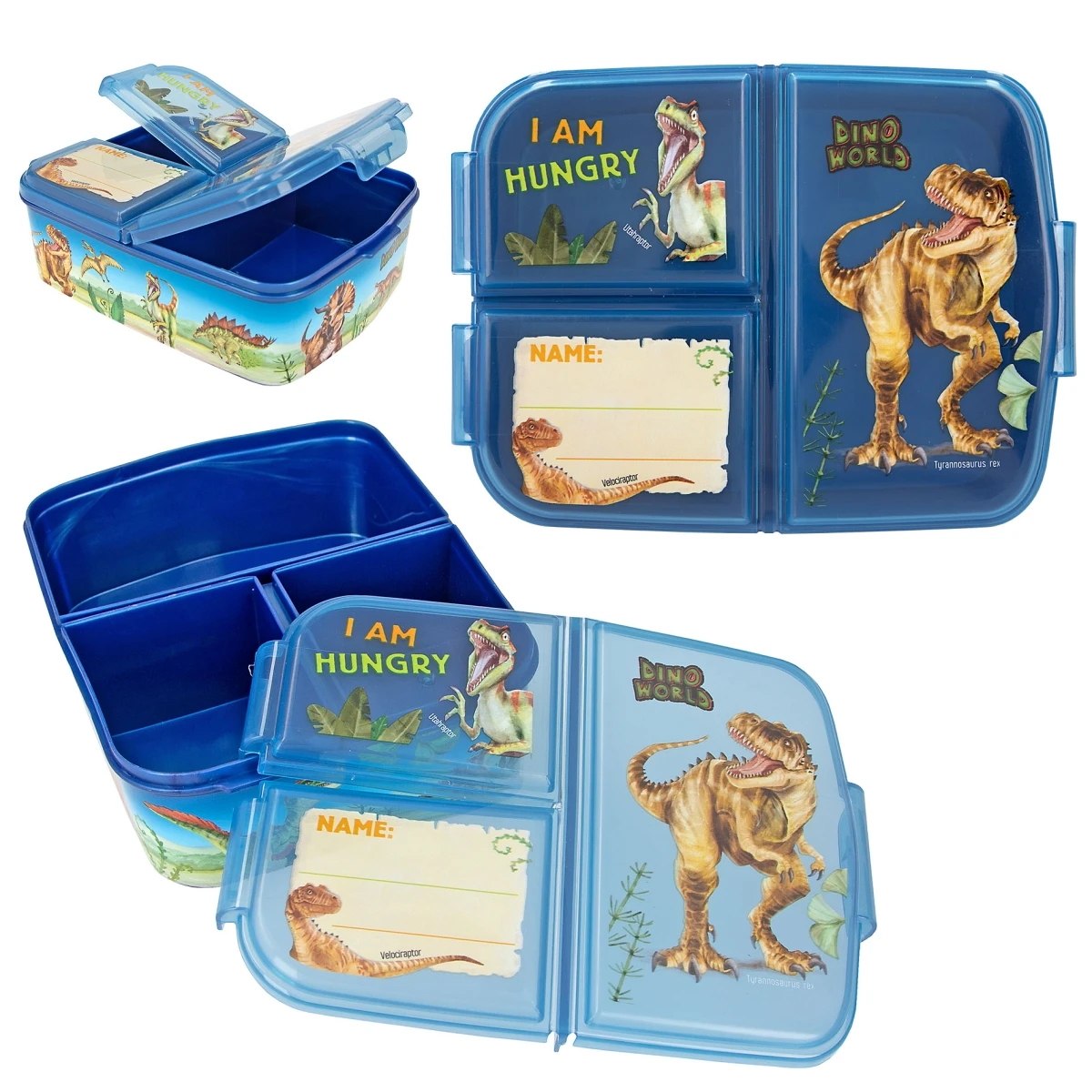 Die blaue Brotdose von Dino World hat supercoole Dino-Motive, einen lustigen Spruch und ein Feld zum Personalisieren mit einem wasserfesten Fineliner (nicht im Lieferumfang enthalten).