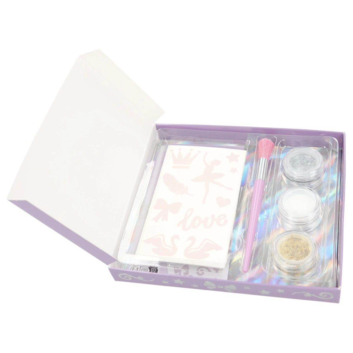 Mit dabei: 42 Klebetattoos aus der Ballett-Welt, 1 Pinsel, 3 Glitzer-Puder (Silber, Weiß, Gold) und eine anschauliche Schritt-für-Schritt-Anleitung.
