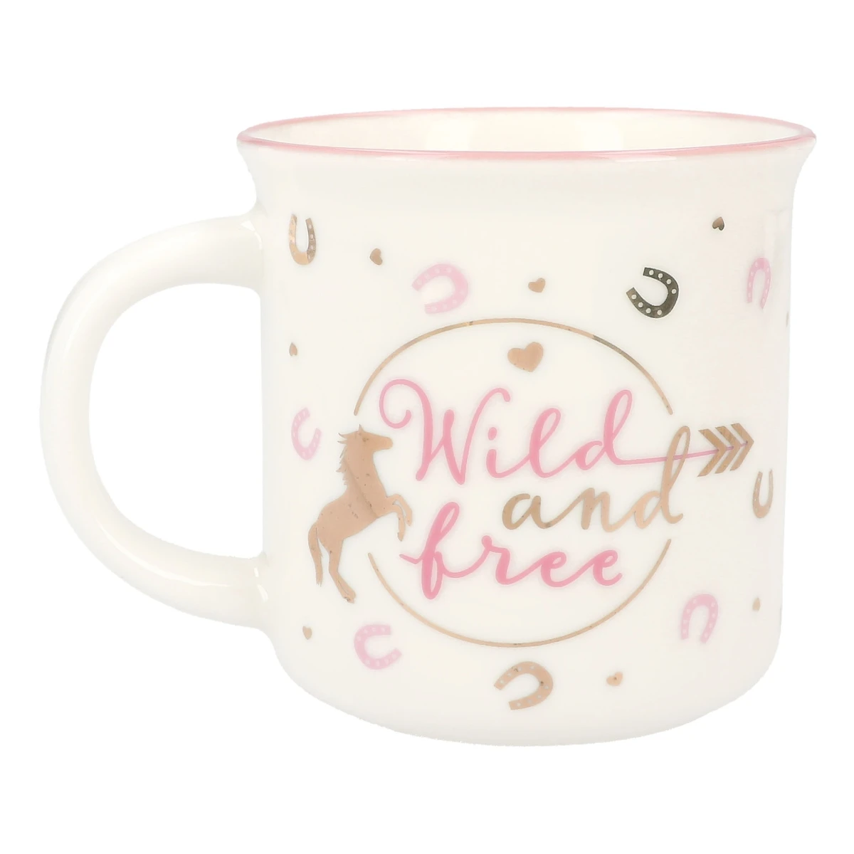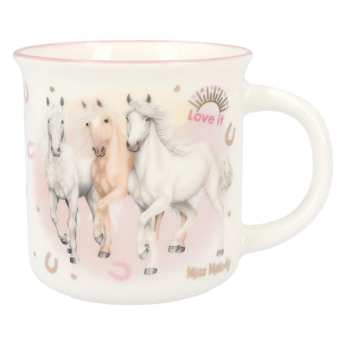 Der Porzellan-Becher von Miss Melody ist ein echter Pferde-Traum: sanfte Farben, edler Goldaufdruck, ein traumhaftes Pferde-Motiv und niedliche Hufeisen.