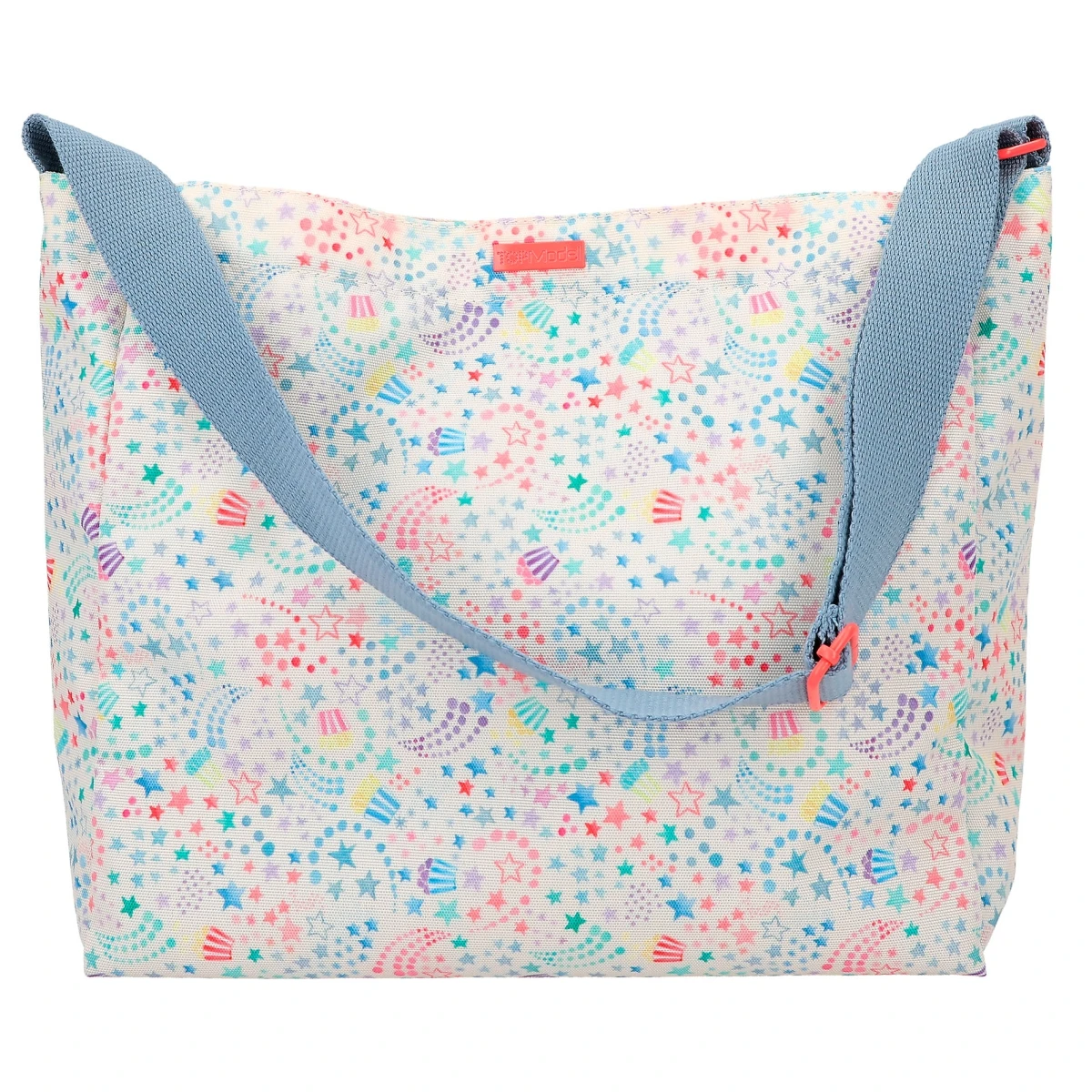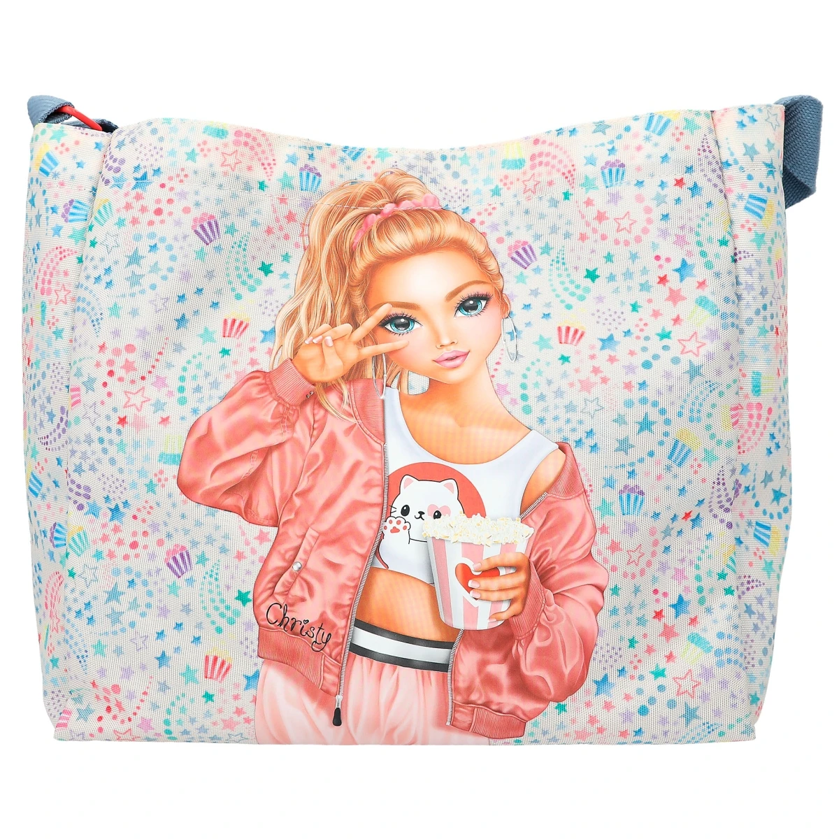 Gute-Laune-Shopper: mit fröhlich-buntem Allover-Print, coolem TOPModel-Motiv, extra Innenfach, verstellbarem hellblauem Umhängegurt und Druckknopfverschluss.