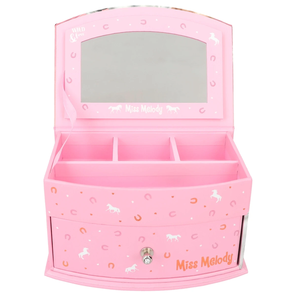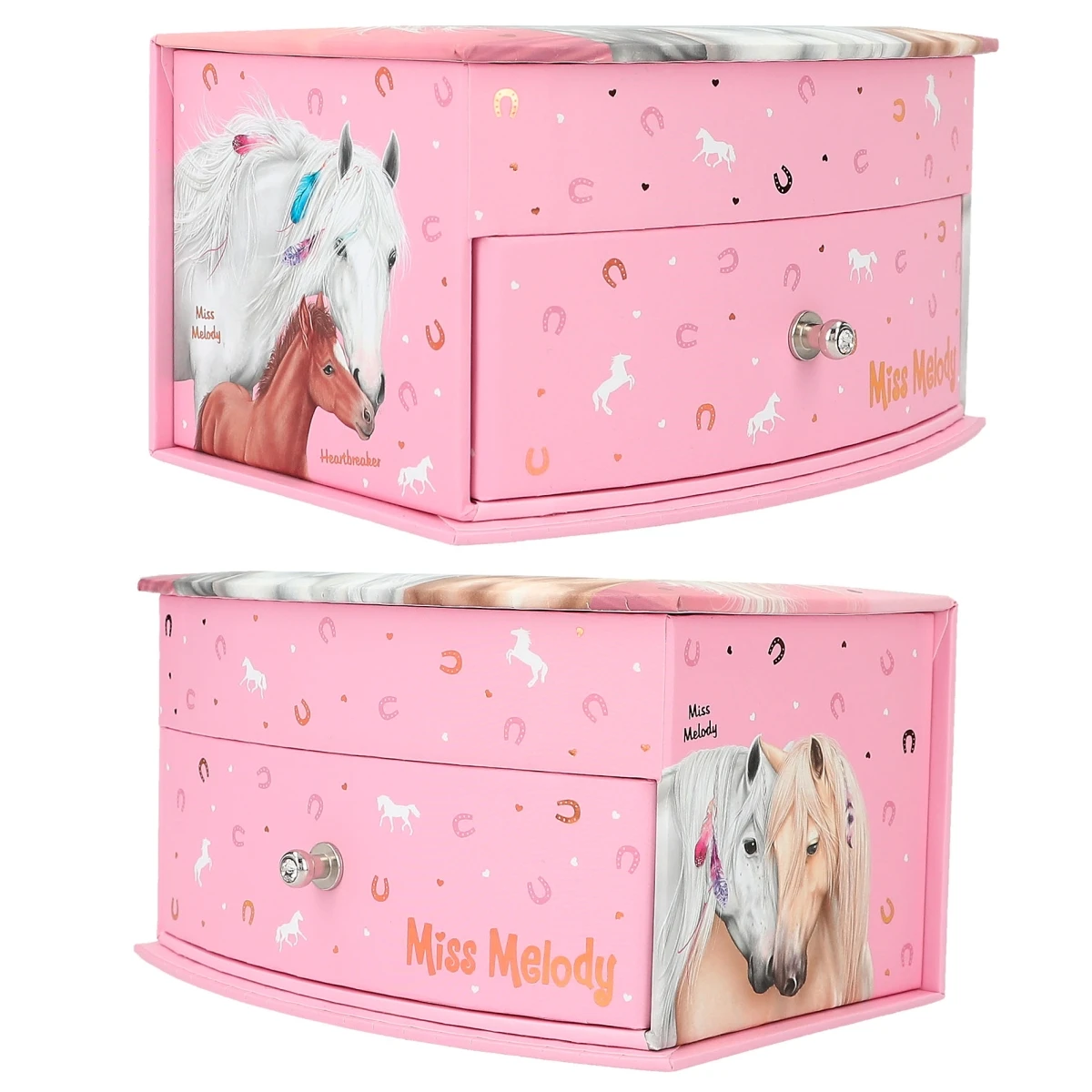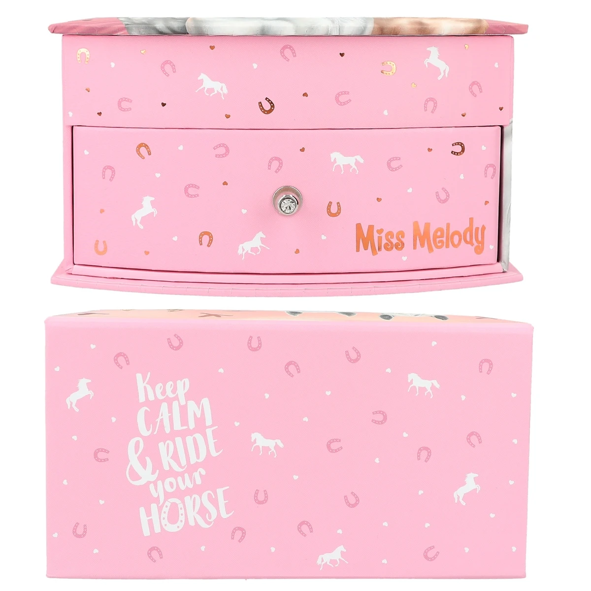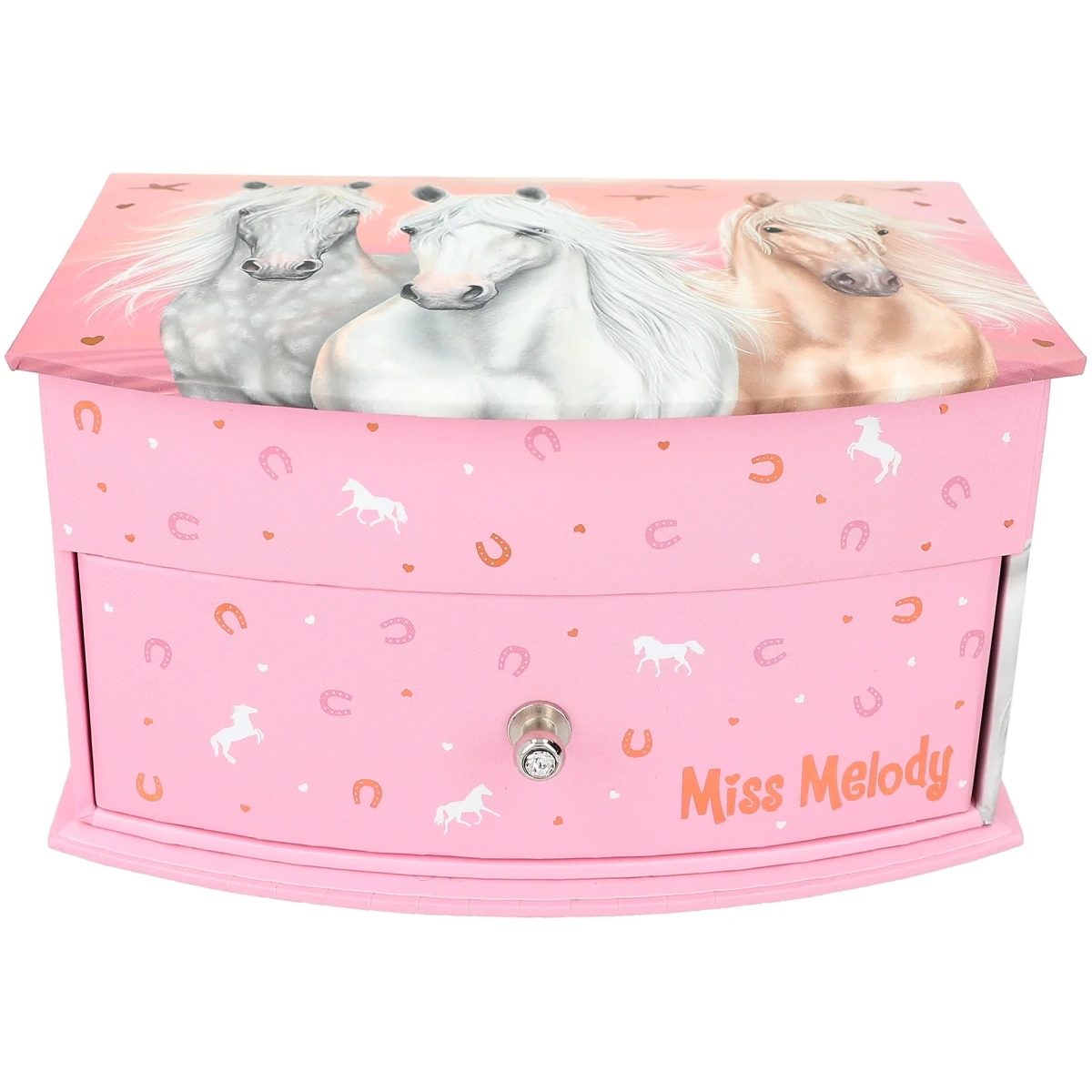 Für Schmuck und andere Kostbarkeiten: Das kleine Schmuckkästchen von Miss Melody in sanften Rosétönen hat ein wunderschönes Pferdemotiv und ein niedliches Hufeisen-Allover.