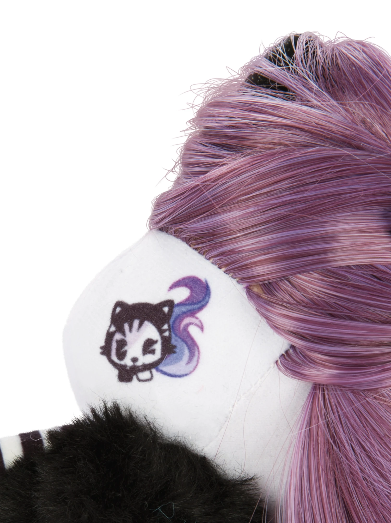 Die Puppe hat lange Haare, einen flauschigen Bauch und ein aufgedrucktes Tattoo.